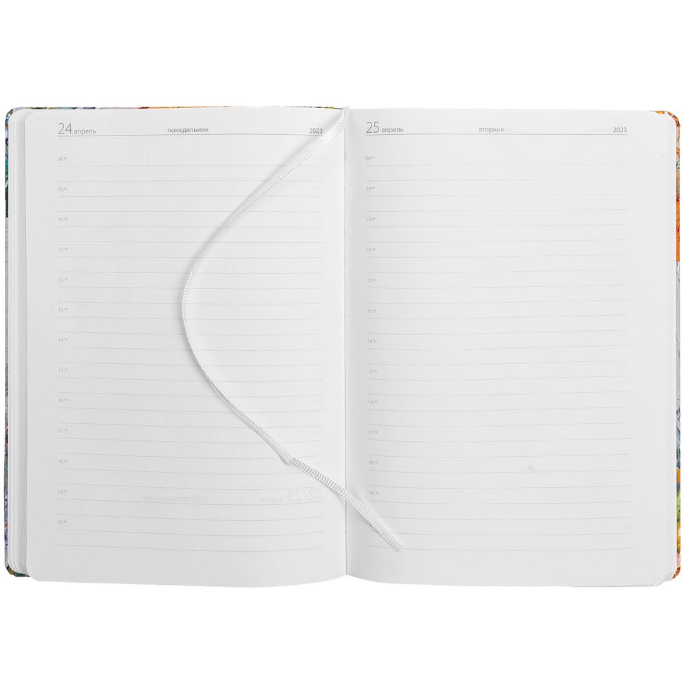 Ежедневник в твердой обложке из картона, дополнен ляссе белого цвета.