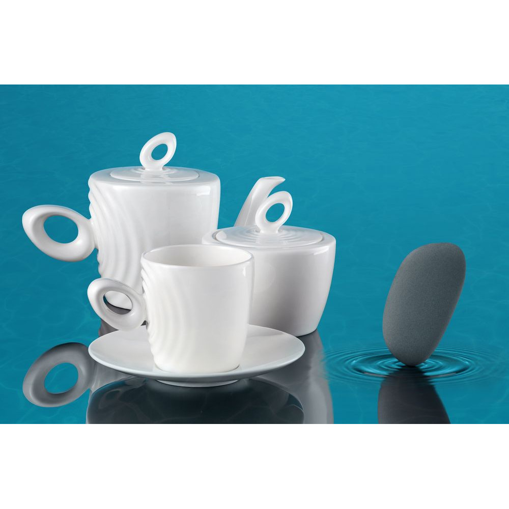 Форма сервиза создана в скульптурной технике: фарфор словно запечатлел сам момент движения. Необычная ручка предметов символизирует камень, от которого появляются завораживающие круги на воде — корпусе изделия.