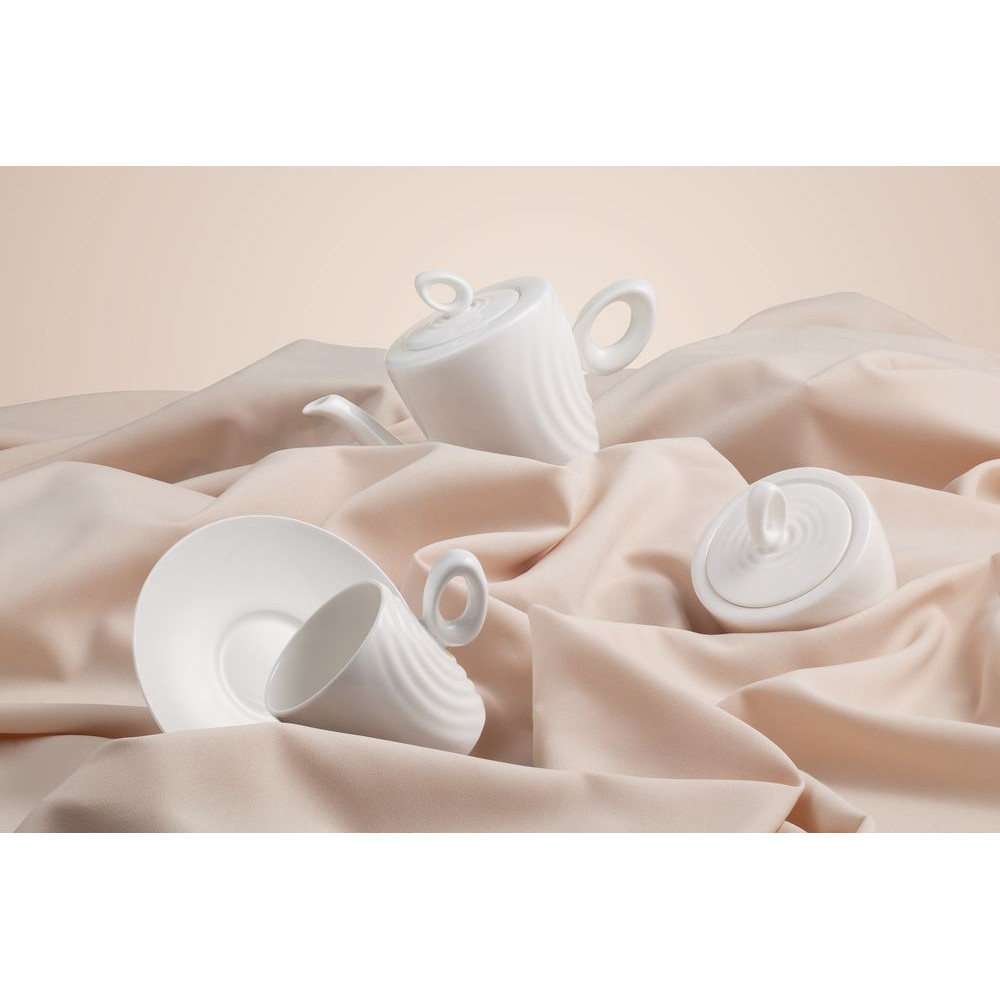 Посуда выполнена из костяного фарфора, что делает ее необычайно легкой и прочной одновременно.При этом благодаря биоморфическим формам кажется, что твердый материал становится мягким и податливым.