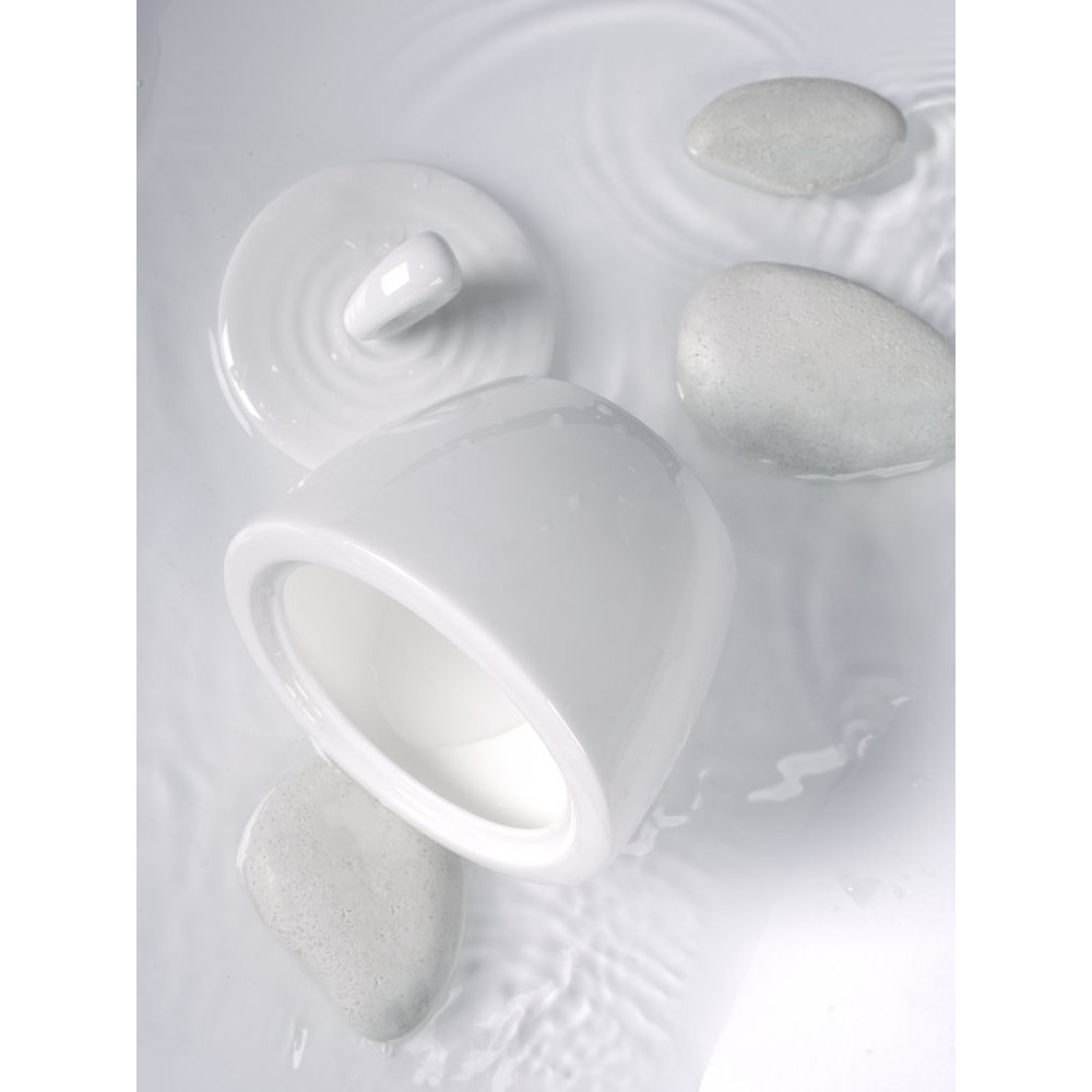 Крышка сахарницы создана в скульптурной технике: фарфор словно запечатлел сам момент движения. Необычная ручка предметов символизирует камень, от которого появляются завораживающие круги на воде.