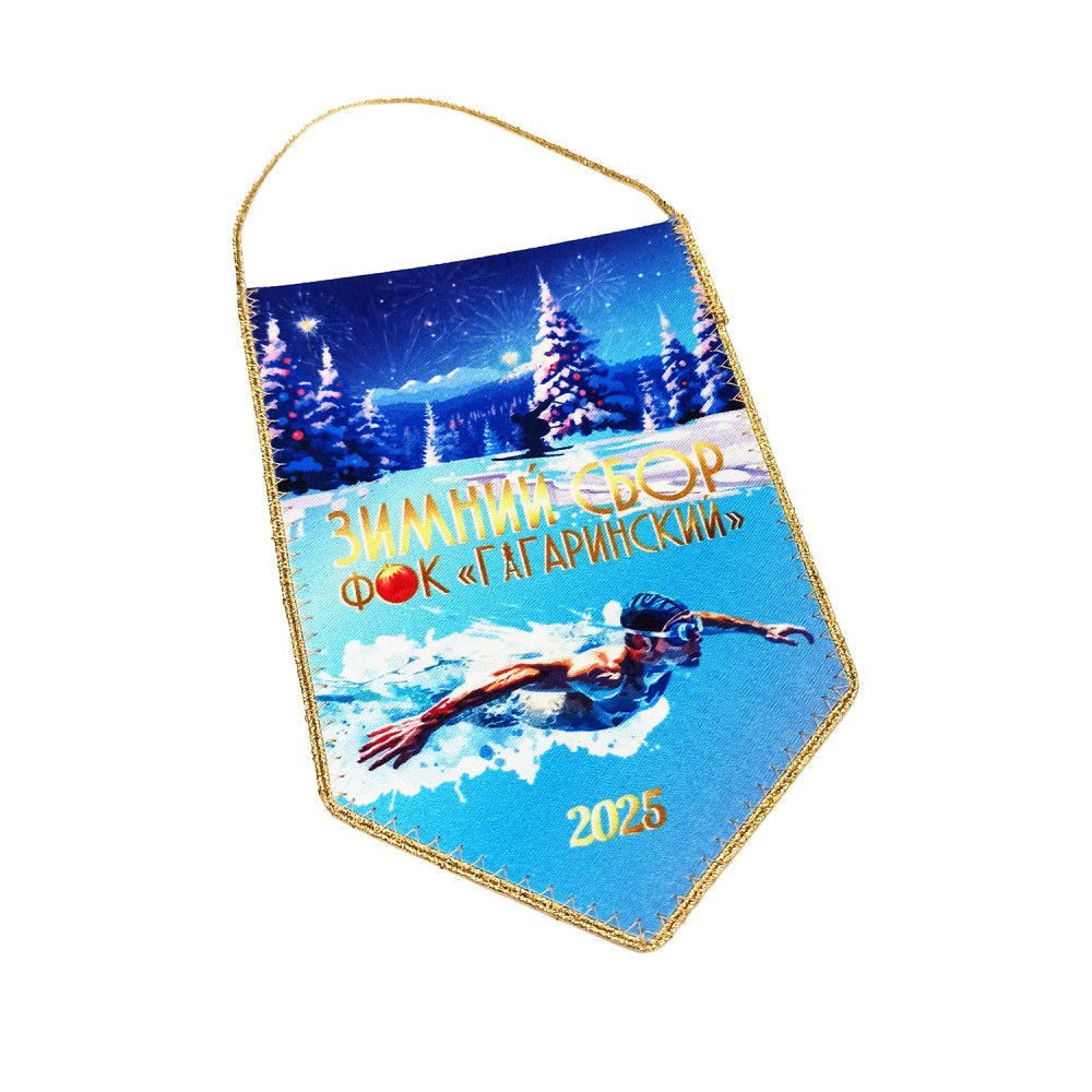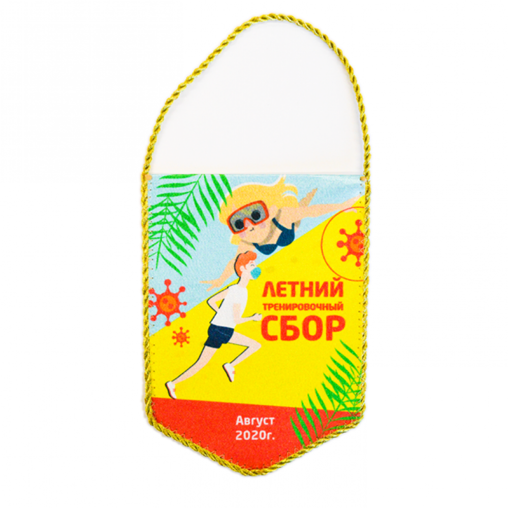 Печатный вымпел изготавливается из крепсатина, имеет основу из картона для придания жесткости, обшивается витым шнуром.