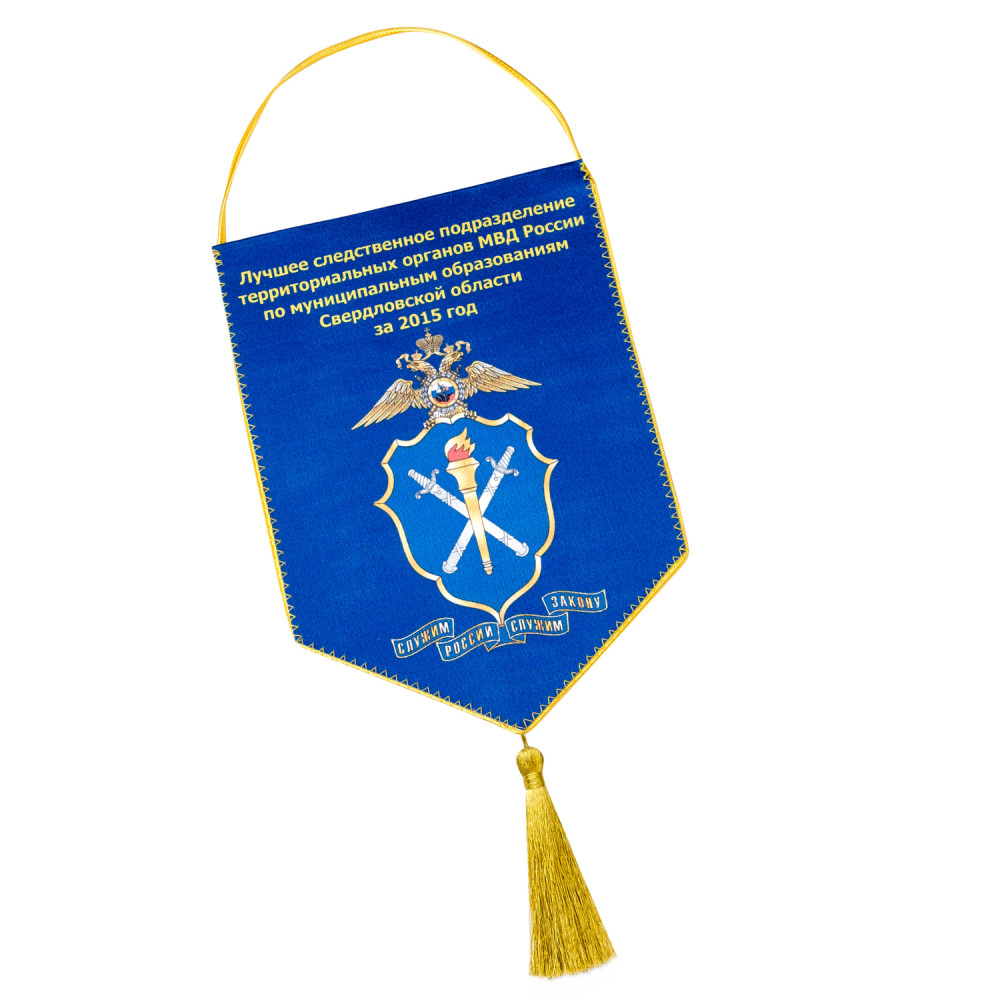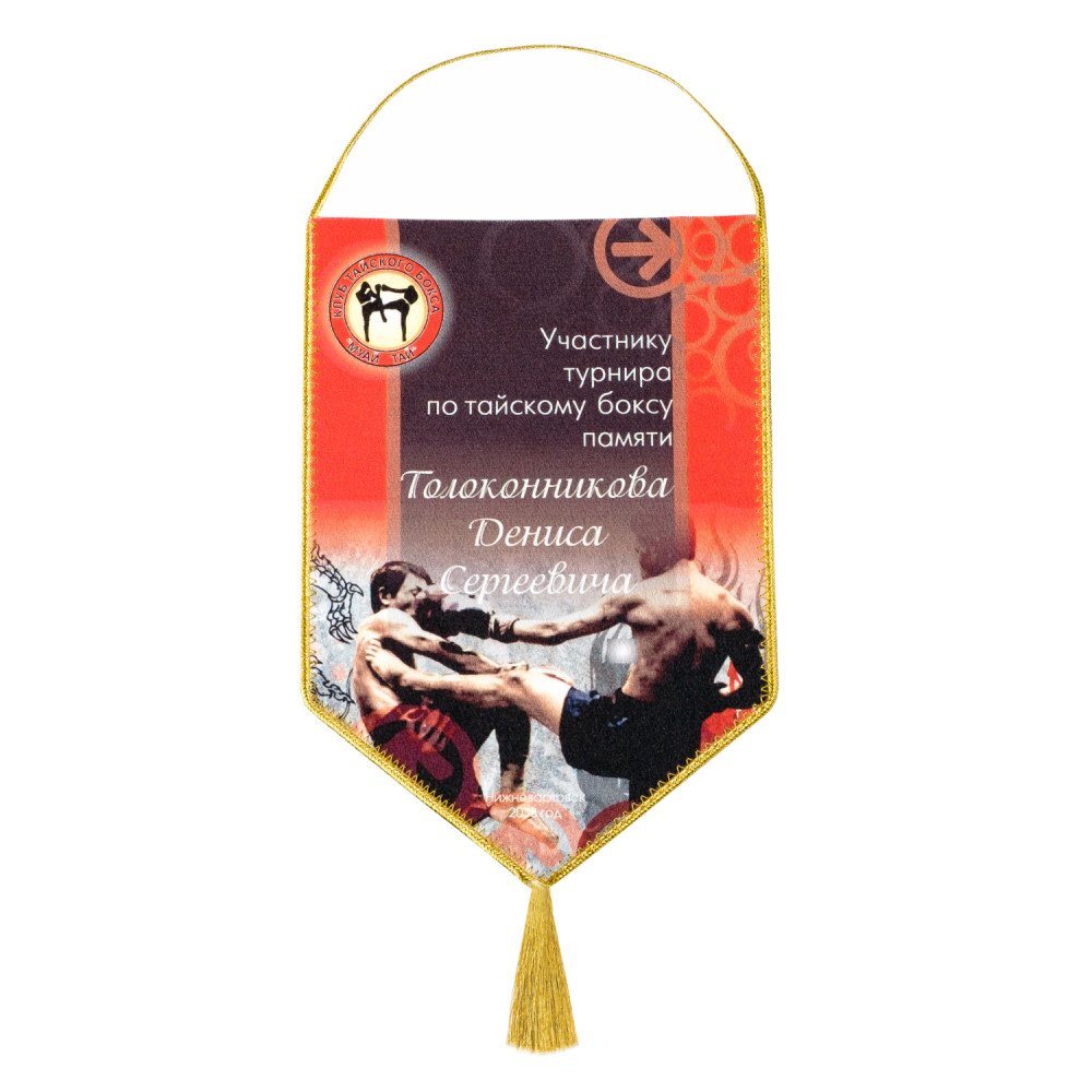 Печатный вымпел изготавливается из крепсатина, имеет основу из картона для придания жесткости, обшивается витым шнуром. По желанию заказчика дополнительно украшается кистью либо из самого шнура, либо дополнительным элементом.