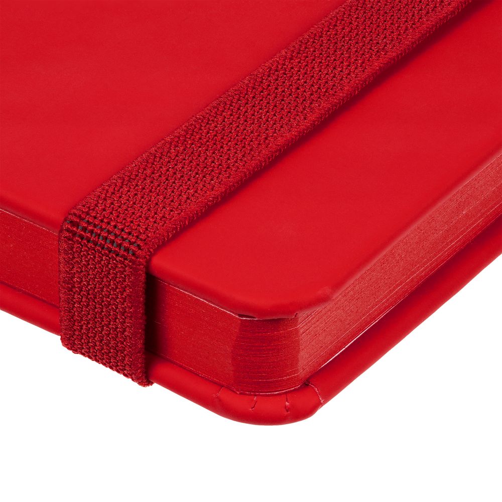 Блокнот в твердой обложке, выполнен из материала Soft Touch Ultra, красный РР, дополнен резинкой и ляссе в цвет обложки.
