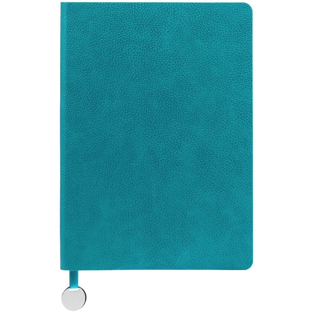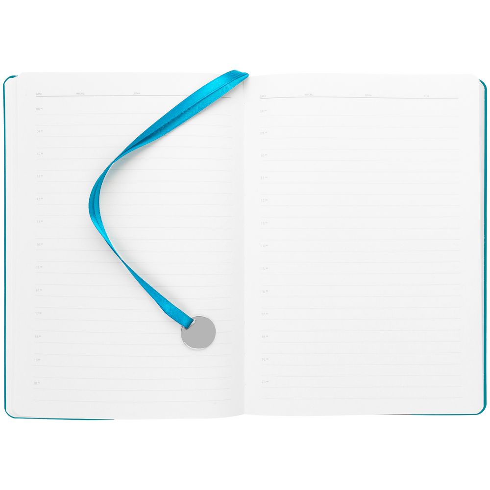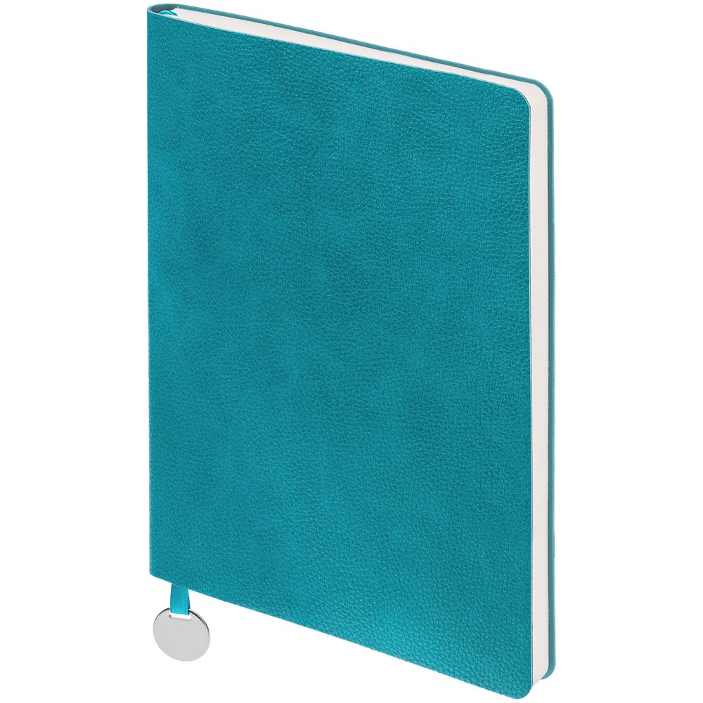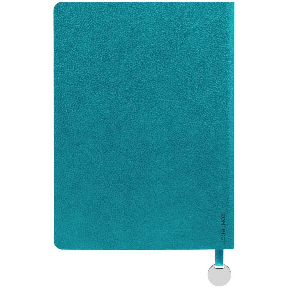 Ежедневник с гибкой обложкой, выполнен из материал La Fite, цвет морской волны II, дополнен ляссе в цвет обложки с металлическим шильдом.