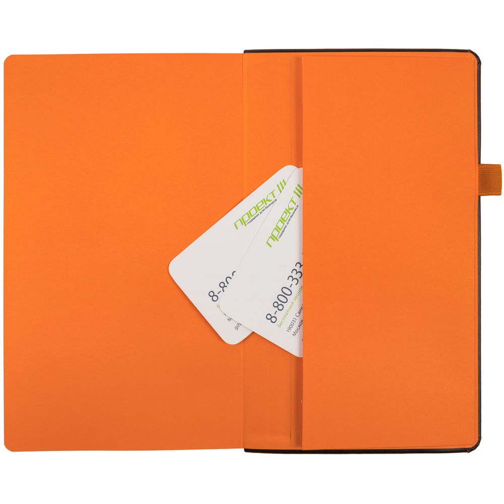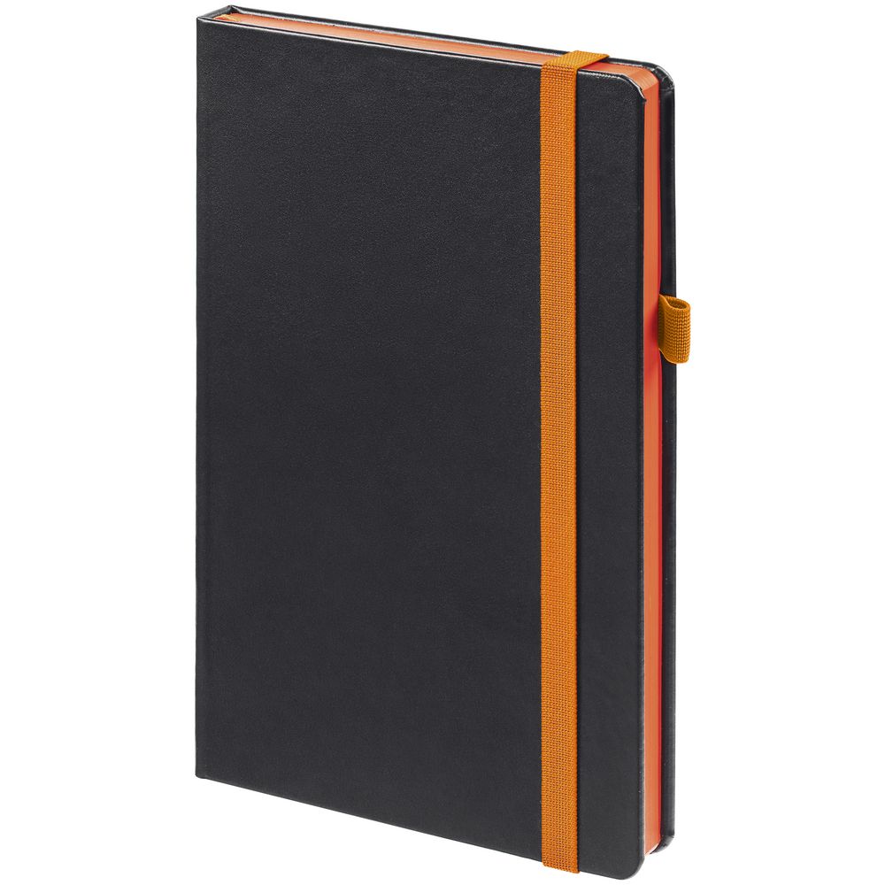 Ежедневник с твердой обложкой, выполнен из материала Waltz, черный АА, дополнен оранжевой резинкой и ляссе.