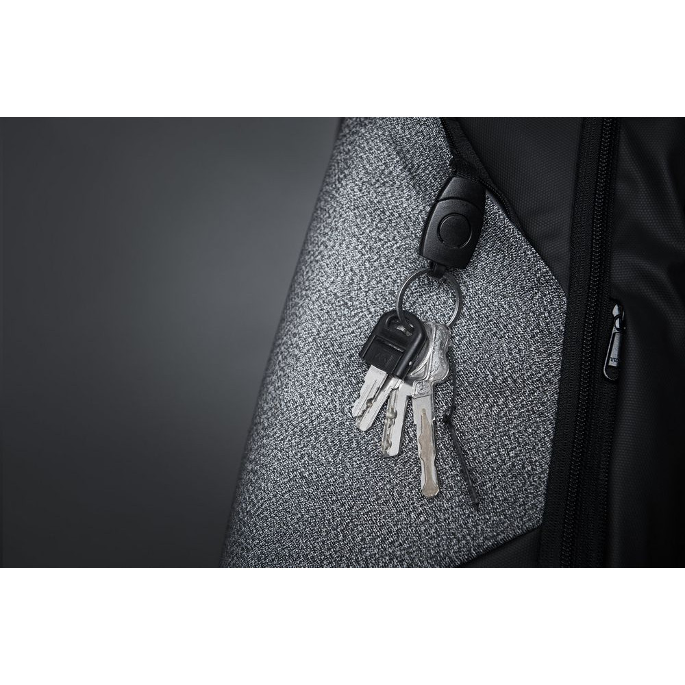 • На внешней стороне рюкзака в стыке серого и черного цвета спрятался треугольный карман на молнии с застежкой фастекс для ключей, которая позволяет легко отстегнуть или пристегнуть ключи