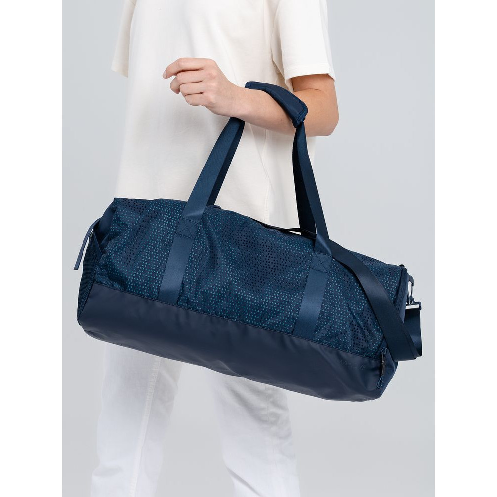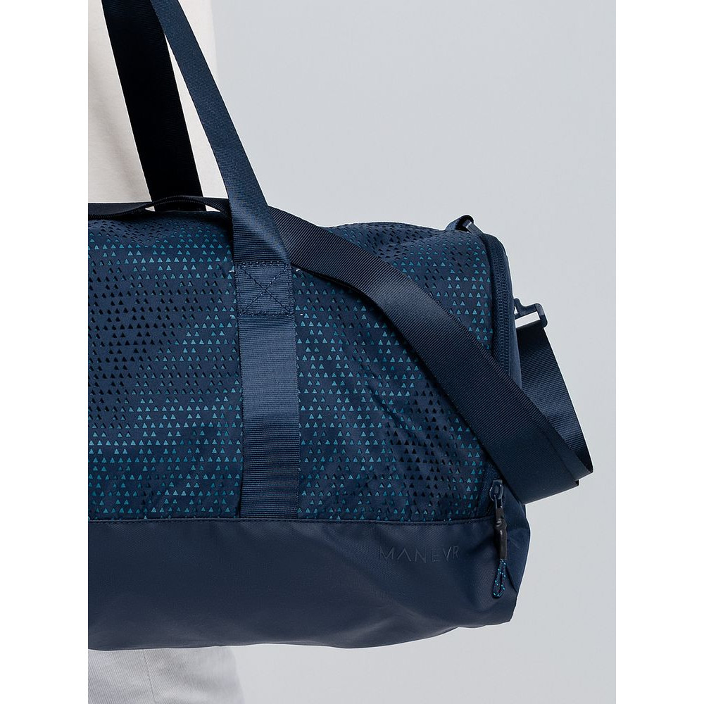 Цвет Outer Space лег в основу коллекции сумок Triangel, позволяя создать модное монохромное сочетание с изделиями Manevr темно-синего цвета. Изделия изготовлены из шелковистого полиэстера, в отделке использована лазерная перфорация паттерна.