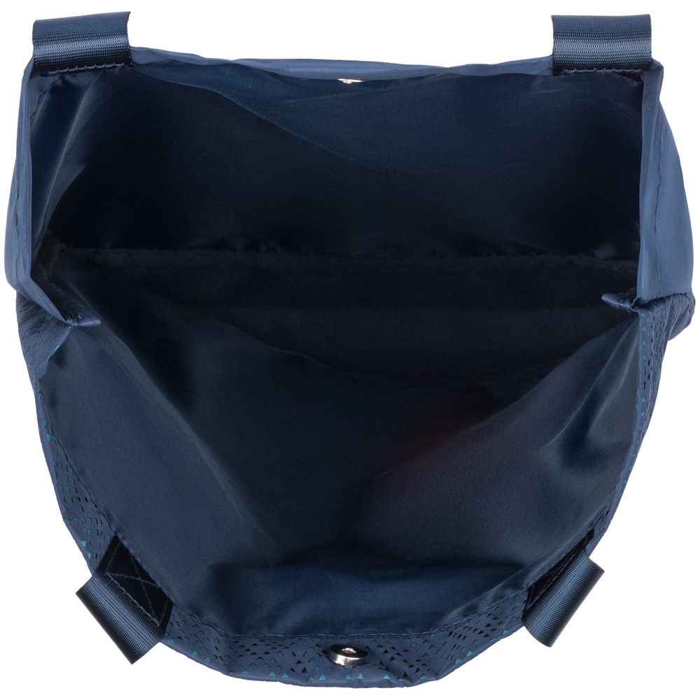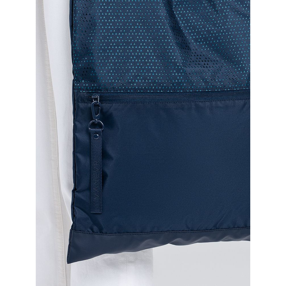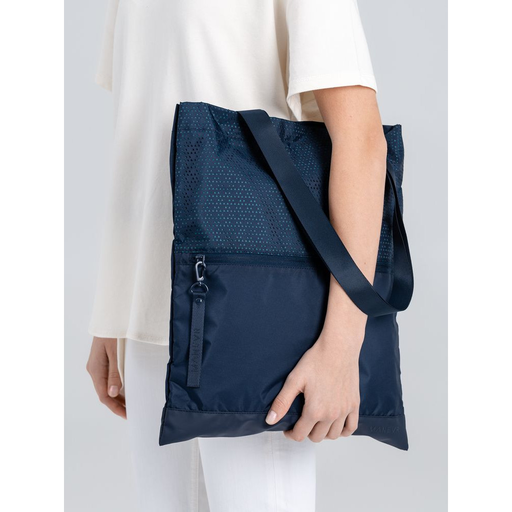 Цвет Outer Space лег в основу коллекции сумок Triangel, позволяя создать модное монохромное сочетание с изделиями Manevr темно-синего цвета. Изделия изготовлены из шелковистого полиэстера, в отделке использована лазерная перфорация паттерна.
