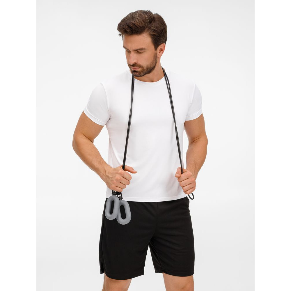 Шнур к ручкам-эспандерам крепится через пластиковый переходник с отверстиями для продевания шнура. Эспандеры выполнены из тактильно приятного силикона, обладающего высокой степенью эластичности и прочности, а широкий шнур (5 мм) — из плотного ПВХ.