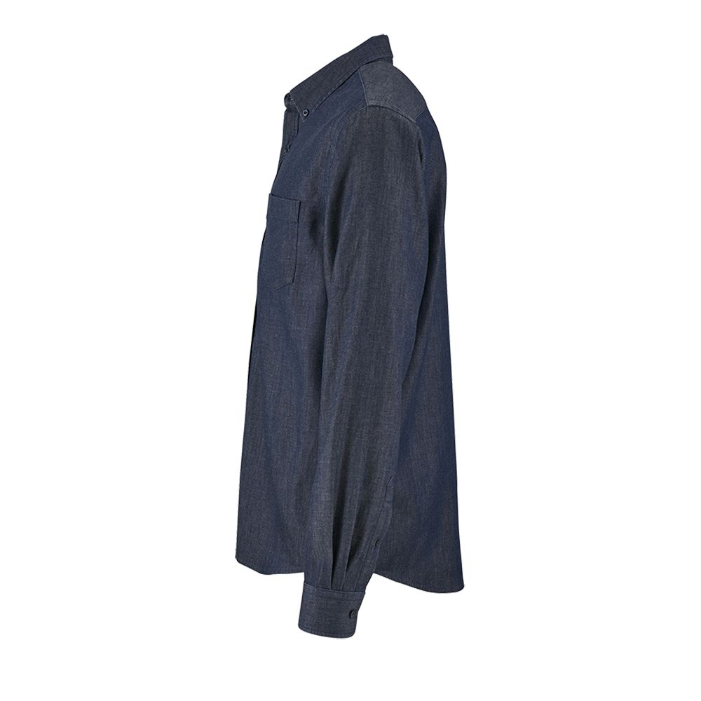 Модель классического кроя из денима с воротником на пуговицах, планкой на 7 пуговиц в тон и манжетами на 1 пуговице.