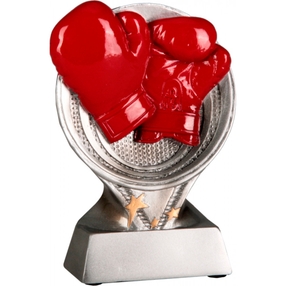 Фигурка литая "Бокс". Материал пластик, цвет серебро. Высота 15,5 см.¶Фигурка представляет из себя круг, внутри которого изображены две окружности друг в друге, фон в виде частых мелких точек. В центре круга изображены две красные боксерские перчатки. В верхней части фигуры перчатки выступают за область круга. Под кругом изображен элемент в форме треугольника с тремя звездами золотого цвета и вдавленным ребристым элементом в форме буквы "V". В нижней части фигуры, под треугольником, изображен цоколь в форме горизонтального четырехугольника. Место под эмблему 60 * 20 мм.