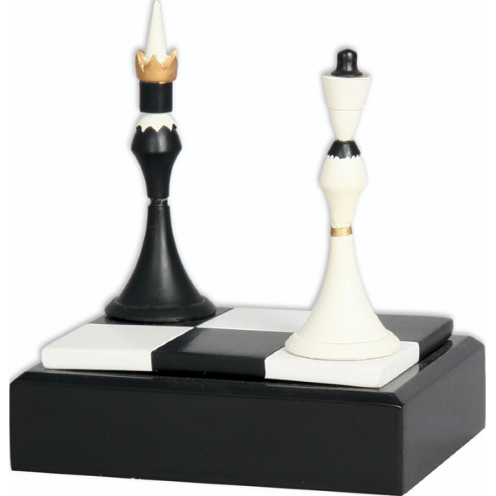 Фигурка литая "Шахматы". Высота 12,5 см. Представляет собой часть шахматной доски, состоящей из шести квадратов, на двух противоположных углах установлены шахматные фигуры: черная и белая. Конструкция установлена на цоколе в форме прямоугольника, цвет черный.