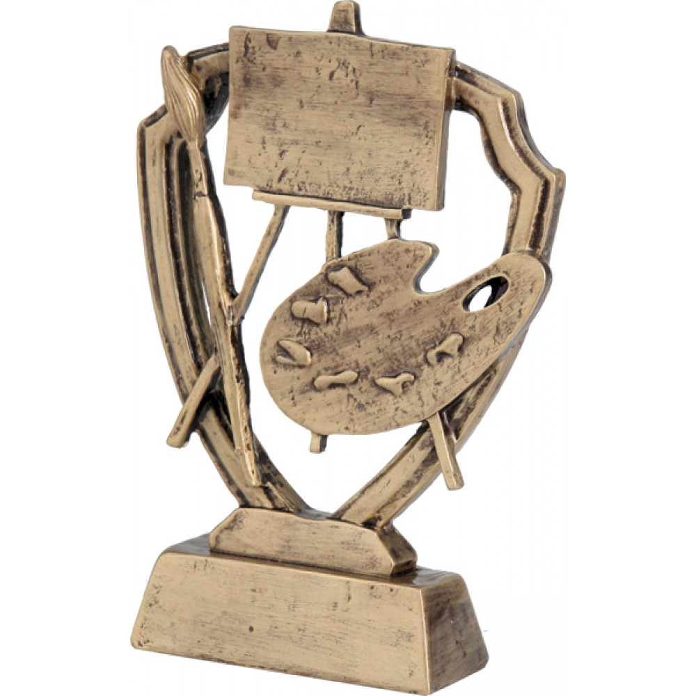 Фигурка литая "Живопись". Цвет бронза. Материал: пластик. Высота 13 см. Изображена окантовка в форме щита, внутри которой расположены мольберт, палитра и кисть. Фигурка установлена на цоколе в форме усеченной пирамиды.