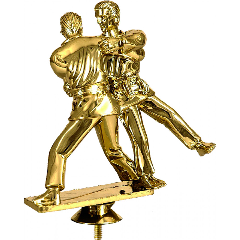 Фигурка пластиковая "Дзюдо". Цвет золото. Высота 15 см. Изображены дзюдоисты, одетые в дзюдоги: штаны, куртка и пояс. Спортсмены находятся в схватке. Один из них касается своим правым боком левый бок другого. Руками держатся за корпус тела друг друга.¶Фигурка установлена на стеме в виде небольшого элемента конусообразной формы. Фигурку возможно закрепить на цоколь, постамент или кубок.