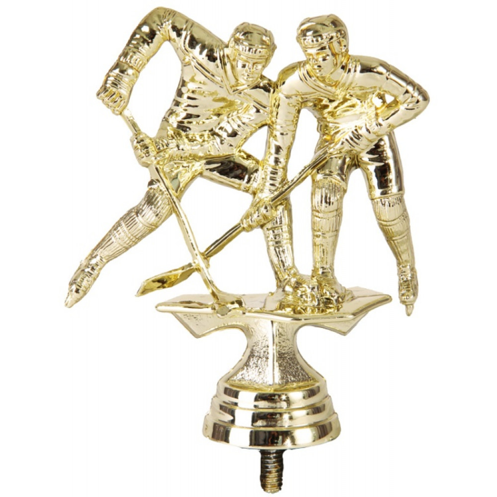 Цвет: золото, материал: пластик. Вид спорта: хоккей. Изображены два хоккеиста, борющихся за шайбу. Они выглядят сконцентрированными на процессе игры, их клюшки сталкиваются в борьбе за победу. Хоккеист справа блокирует своей клюшкой клюшку своего противника. Ощущение движения создаётся за счёт приподнятых ног, зависших в воздухе. Оба хоккеиста согнуты в пояснице. Игроки одеты в хоккейную форму, их головы защищает шлем, а руки защищены крагами. Хоккеисты находятся на тонкой пластине – имитации льда. Высота, см: 11.4. Фигурку возможно закрепить на цоколь, постамент или кубок.