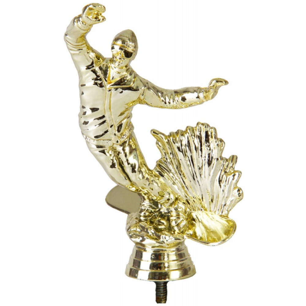 Цвет: золото, материал: пластик. Вид спорта: сноуборд. Фигурка выполнена в виде сноубордиста. Руки спортсмена расставлены по сторонам, его тело находится под наклоном. Он одет в экипировку, глаза защищены очками. От скорости сноуборда снег разлетается в разные стороны. Ботинки крепко прикреплены к сноуборду, что не позволяет спортсмену упасть. Ниже - круглое основание, на котором имеются горизонтальные линии. Высота, см: 16.5 Вес, кг: 0.082. Фигурку возможно закрепить на цоколь, постамент или кубок.