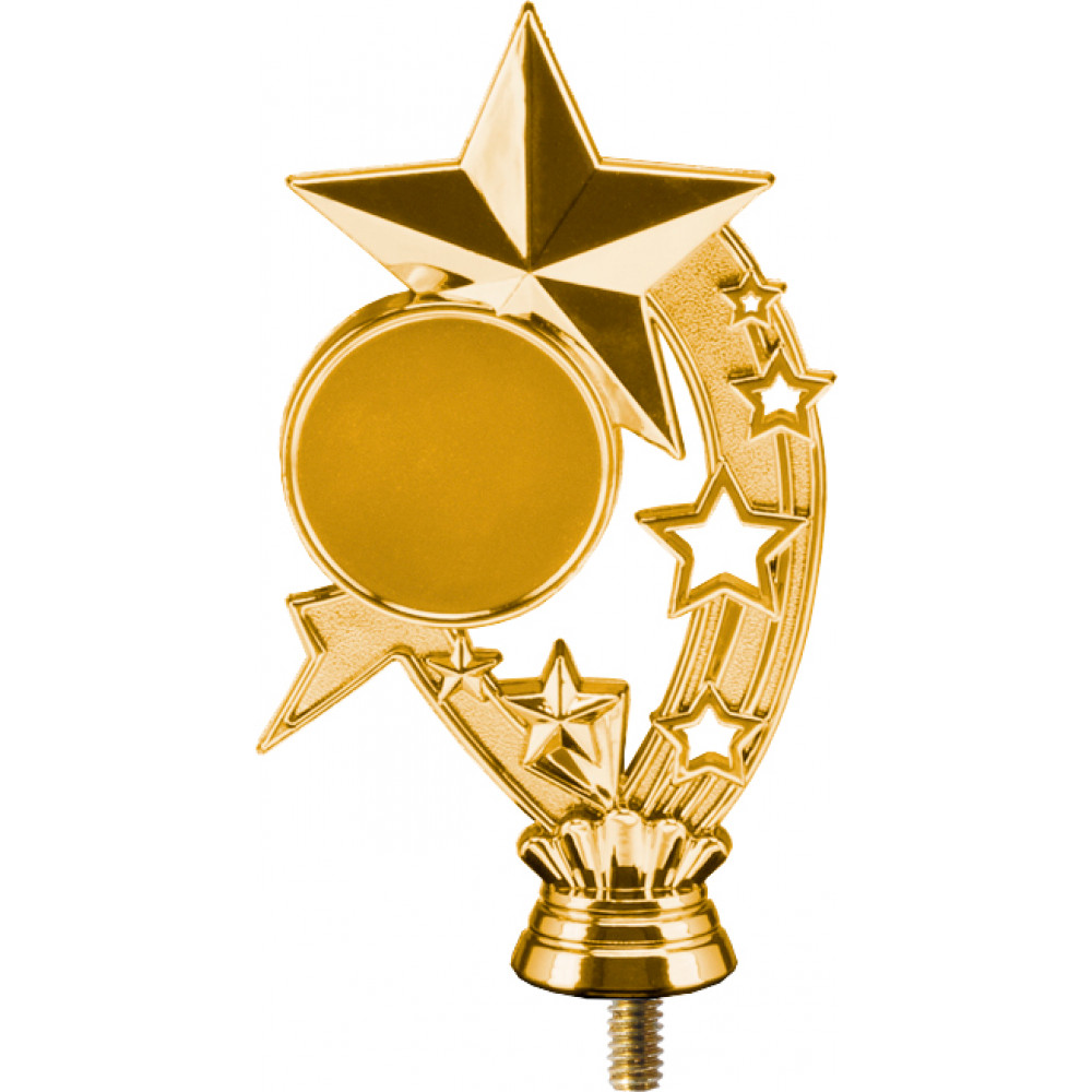 Фигурка пластиковая "Звезды". Цвет золото. Высота 17 см. Изображена дуга, на которой находятся рельефные звезды, на вершине дуги изображена большая звезда. Под звездой расположено место под вкладку, диаметр 50 мм. Фигурка установлена на стеме в виде небольшого элемента конусообразной формы. Фигурку возможно закрепить на цоколь, постамент или кубок.