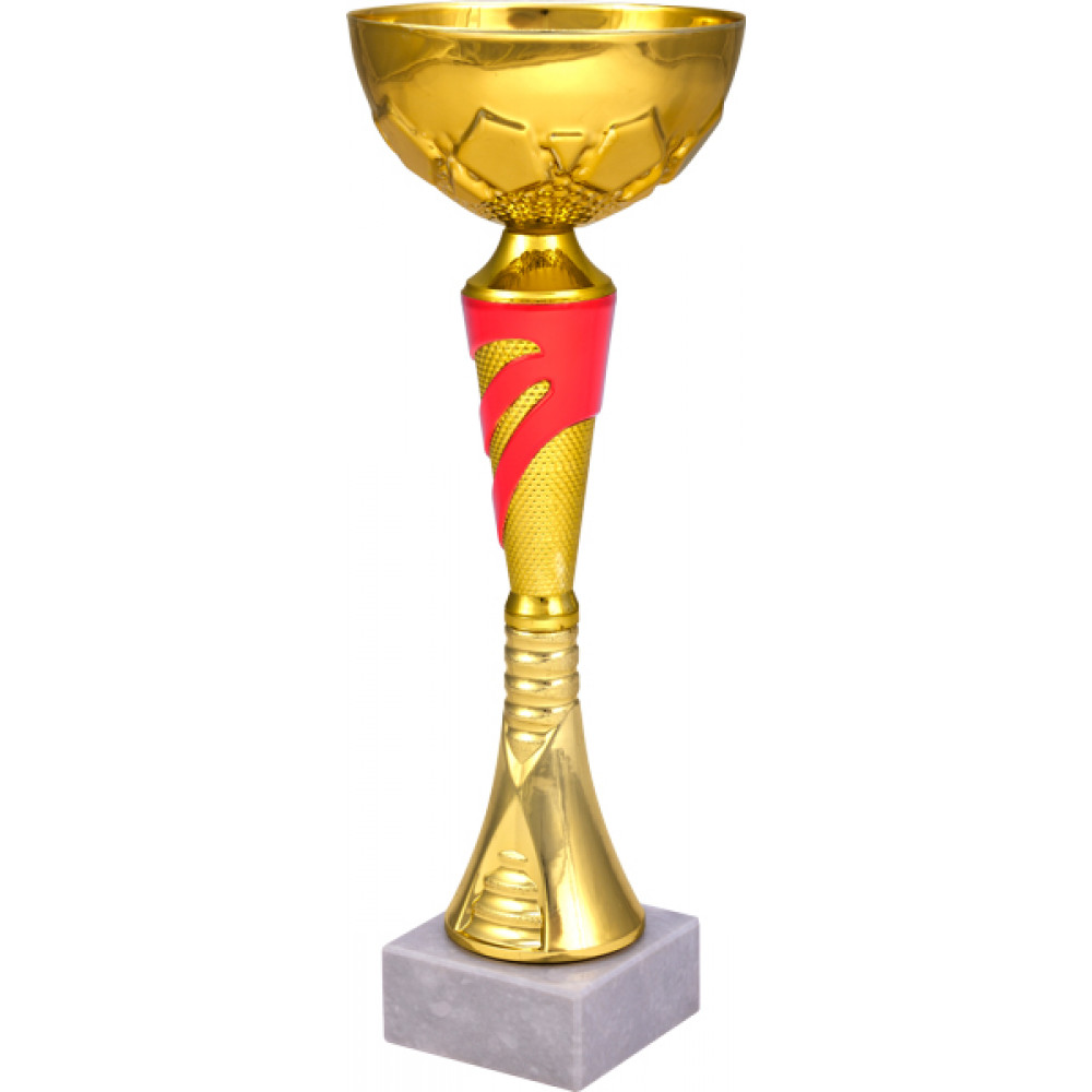Кубок состоит из трех элементов: чаша, стем, цоколь. ¶Чаша кубка изготовлена из стали, с гальваническим покрытием. Цвет внутри и снаружи - золото. Форма чаши - полушар. Чаша имеет рельеф по всей окружности в виде выпуклых фигур, напоминающих граненные самоцветы. Рельеф расположен у основания чаши. ¶Стем состоит из трех частей. Верхняя часть стема кубка представлена в форме короткого конусообразного элемента с гладкой поверхностью, цвет - золото. Средняя часть стема золотого цвета, имеет форму перевернутого конуса. Поверхность элемента представлена мелкими частыми точками, в верхней части расположен узор в виде широких полос красного цвета, идущих по диаметру. Нижняя часть стема золотого цвета, имеет конусообразную форму. Имеет узор в виде рельефных окантовывающих линий, идущих по всей высоте элемента. В центральной и нижней части линии огибает широкий элемент с гладкой поверхностью.¶Цоколь кубка имеет квадратную форму. Материал - мрамор. Цвет - белый, неоднородный.