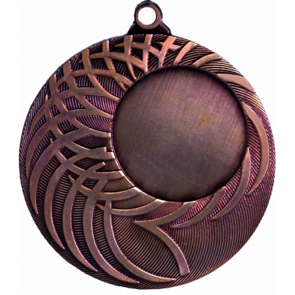 Медаль круглая металлическая. Диаметр 50 мм, толщина 3 мм.¶Цвет медали, имитирующий золото/серебро/бронзу.¶Сверху расположено круглое ушко для крепления ленты. ¶В правой верхней части аверса медали расположено место под вставку, диаметр 25 мм¶Фон медали в виде тонких выпуклых линий, закругленных по часовой стрелке. Поверх них нанесены выпуклые толстые линии с гладкой поверхностью, закругленные, пересеченные между собой и образующие ромбы. ¶На медали нет никаких других изображений, нет рисунков, относящихся к конкретному виду спорта.
