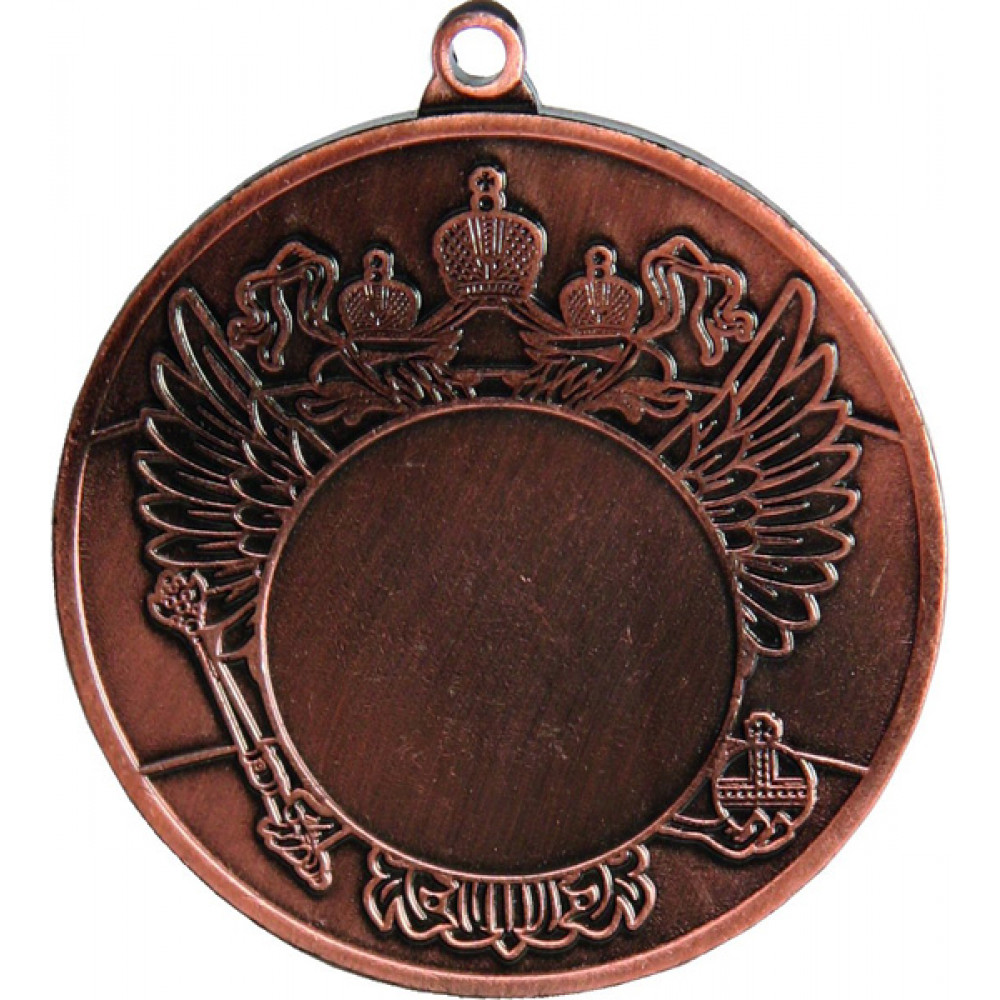 Медаль круглая металлическая. Диаметр 50 мм, толщина 2 мм.¶Цвет медали, имитирующий золото/серебро/бронзу.¶Сверху расположено округлое ушко для крепления ленты. ¶На лицевой стороне медали расположен выпуклый рельеф в виде герба РФ.¶В центре герба - место под вставку диаметром 25 мм, имеет тонкую окантовку. Фон медали гладкий, медаль делят две горизонтальные линии на три равные части, медаль имеет кант.¶На медали нет никаких других изображений, нет рисунков, относящихся к конкретному виду спорта.