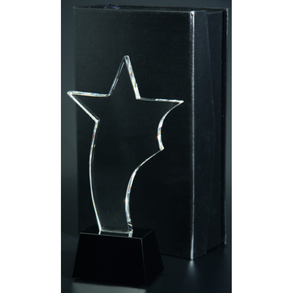 Награда хрустальная, прозрачная. Высота 25,5 см. Толщина фигуры 10 мм. В комплекте футляр из бумвинила.¶Фигура представляет собой эелемент в форме звезды, левый нижний угол фигуры преобразован в удлиненную вертикальную широкую полосу. Фигура установлена на цоколе в форме усеченной пирамиды, материал - пластик, цвет - черный.