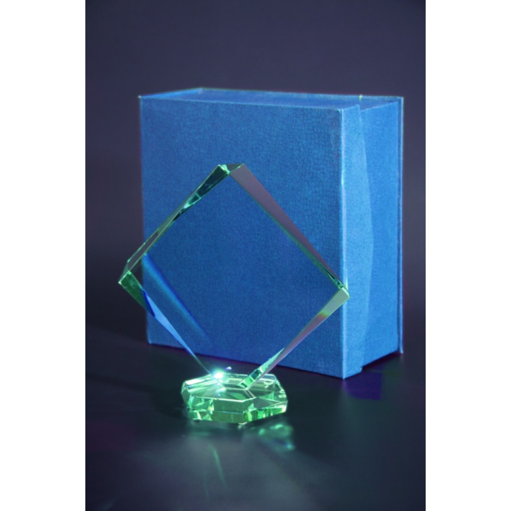 Награда стеклянная, прозрачная. В комплекте футляр из бумвинила. Награда в форме ромба. Фигура установлена на подставку в форме равностороннего шестиугольника.