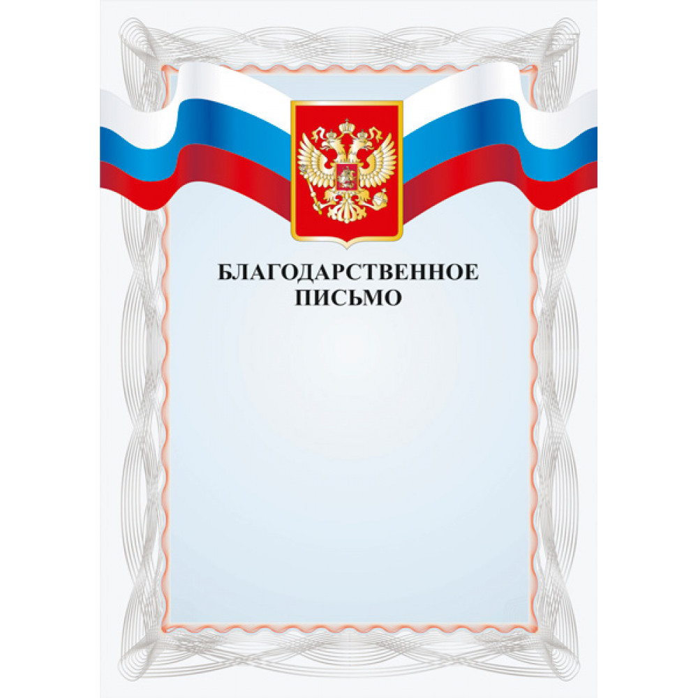 Благодарственное письмо, формат А4. Бумага матовая, толщина 200 гр, полноцветная печать. ¶Фон серый. В верхней части написано "Благодартсвенное письмо" в две строчки, шрифт без наклона, цвет черный. Над текстом изображена лента триколор, по центру которой изображен герб России. Серый фон имеет рамку, на которой изображен узор из окружностей серого цвета.