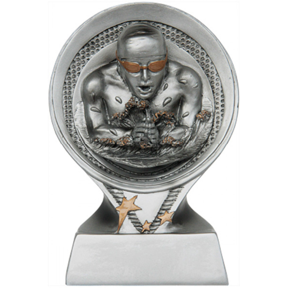 Фигурка литая "Плавание". Материал пластик, цвет серебро.¶Фигурка представляет из себя круг, внутри которого изображены две окружности друг в друге, фон в виде частых мелких точек. В центре круга изображен пловец в анфас в очках золотого цвета. Под кругом изображен элемент в форме треугольника с тремя звездами золотого цвета и вдавленным ребристым элементом в форме буквы "V". В нижней части фигуры, под треугольником, изображен цоколь в форме горизонтального четырехугольника.