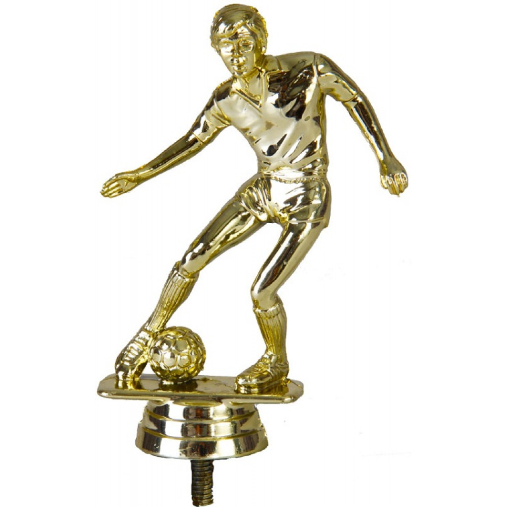 Цвет: золото, материал: пластик. Вид спорта: футбол. Фигурка выполнена в виде футболиста готового к удару. Его ноги согнуты в коленях, руки непроизвольно зависли в воздухе. Игрок сконцентрировано смотрит на свою цель, не отводя взгляда. Левая нога немного повёрнута в сторону мяча, а правая приподнята на носок. Футболист находится на тонкой круглой пластине – имитации футбольного поля. Ниже - круглое основание, на котором имеются горизонтальные линии. Высота, см: 12.1. Фигурку возможно закрепить на цоколь, постамент или кубок.