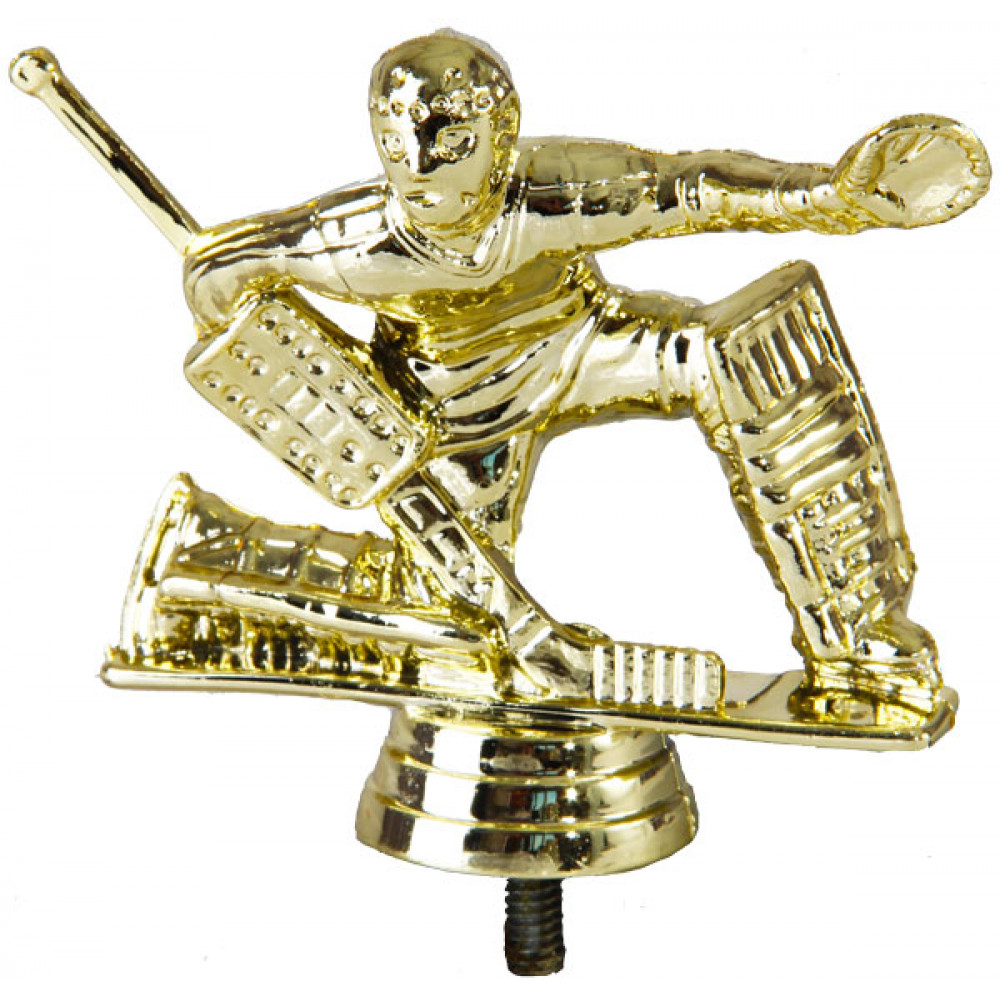 Цвет: золото, материал: пластик. Вид спорта: хоккей. Фигурка выполнена в виде мужчины-вратаря, который защищает ворота от нападения. Он стоит на одном колене, вторая нога выставлена в сторону. Его левая рука вытянута в попытке поймать шайбу, во второй руке зажата клюшка. Хоккеист одет в защиту. Высота, см: 9.2. Фигурку возможно закрепить на цоколь, постамент или кубок.
