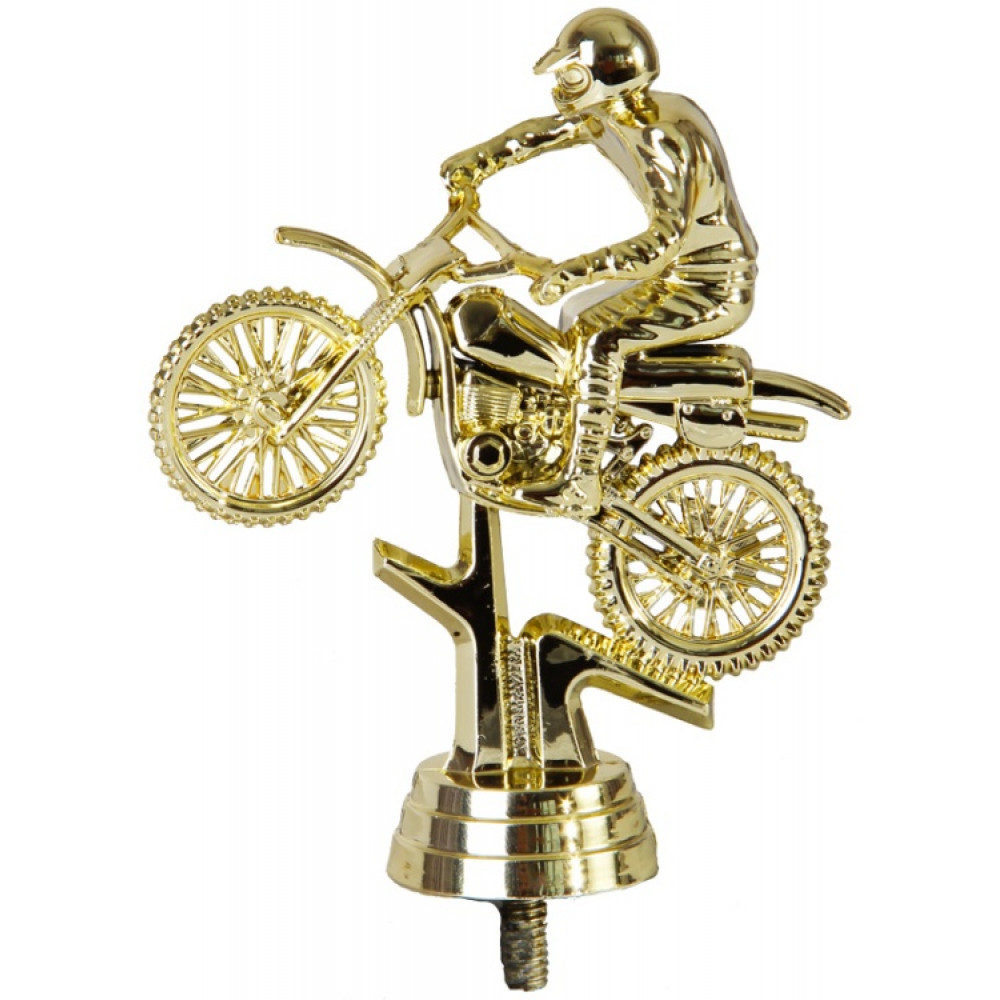 Цвет: золото, материал: пластик. Вид спорта: мотоспорт. Фигурка выполнена в виде мотоциклиста, который делает прыжок на мотоцикле. Верхнее колесо поднято вверх, и кажется, что нижнее через секунду окажется в воздухе. Мотоциклист крепко сжимает руль, повёрнутый в сторону, двумя руками. Он пригибается к мотоциклу, крепко обхватывает ногами свой транспорт. Мотоциклист одет в шлем и специальную защитную форму. Высота, см: 15.2 Фигурку возможно закрепить на цоколь, постамент или кубок.