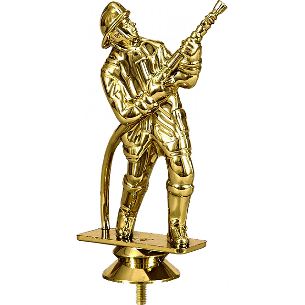 Фигурка пластиковая "Пожарный". Цвет золото. Высота 6 см. Изображен пожарный в профессиональном обмундировании, держащий в руках шланг для тушения, шланг направлен в верх. Фигурка установлена на стеме в виде небольшого элемента конусообразной формы. Фигурку возможно закрепить на цоколь, постамент или кубок.