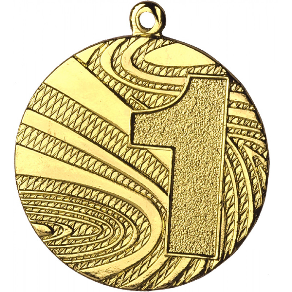 Медаль круглая металлическая. Диаметр 40 мм, толщина 2 мм.¶Цвет медали, имитирующий золото/серебро/бронзу.¶Сверху расположено округлое ушко для крепления ленты. ¶На аверсе медали нет места под вставку. ¶С правой стороны по центру медали расположена цифра 1/2/3, соответственно цветам золото/серебро/бронза. Цифра имеет окантовку, поверхность цифры в виде напыления. Фон медали украшен овалами, расположенными в форме беговых дорожек, друг в друге, в виде широких линий, пространство между линиями наполнено тонкими перекрещенными линиями.¶На медали нет никаких других изображений, нет рисунков, относящихся к конкретному виду спорта.