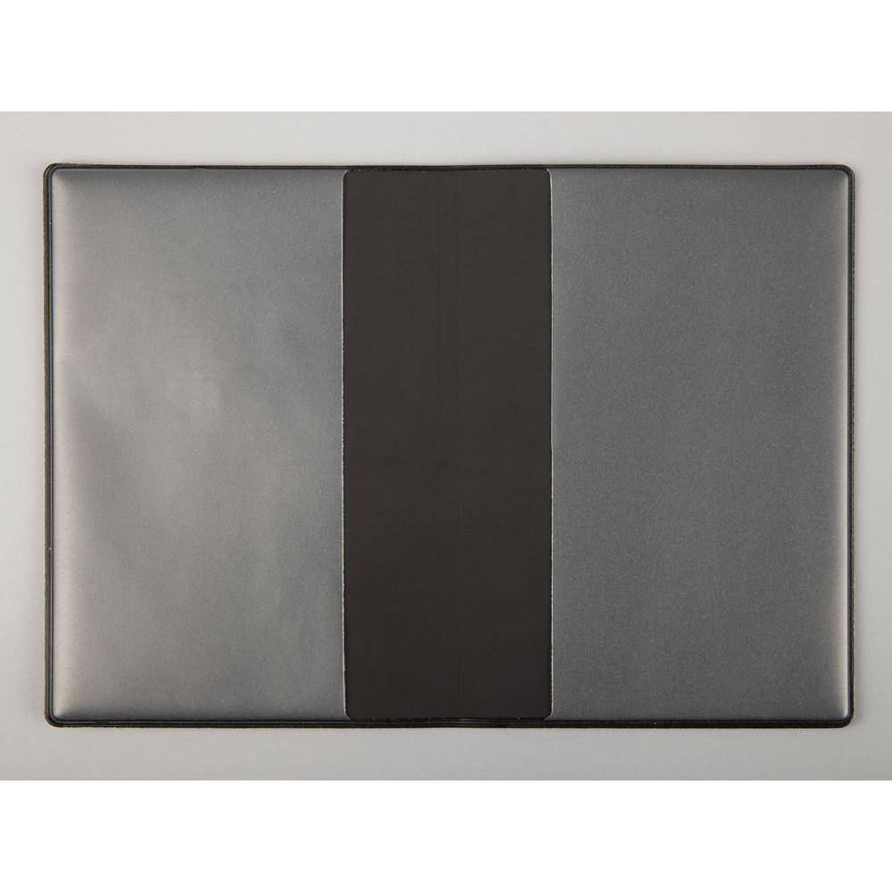 Снаружи обложка выполнена из материала с имитацией сафьяновой кожи, внутри — материал с эфффектом софт тач и кармашки из прозрачного ПВХ.
