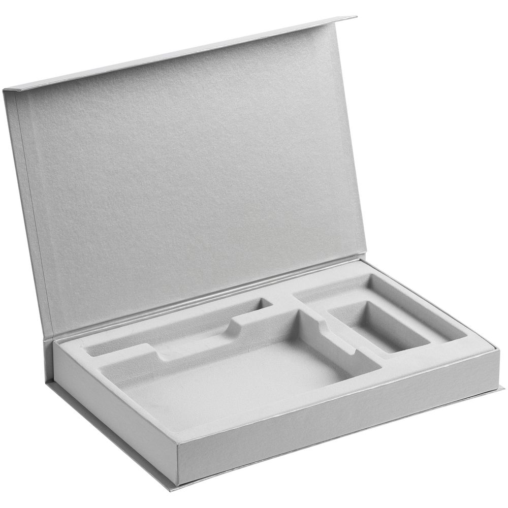 Коробка Silk с ложементом под ежедневник 10x16 см, аккумулятор и ручку, серебристая