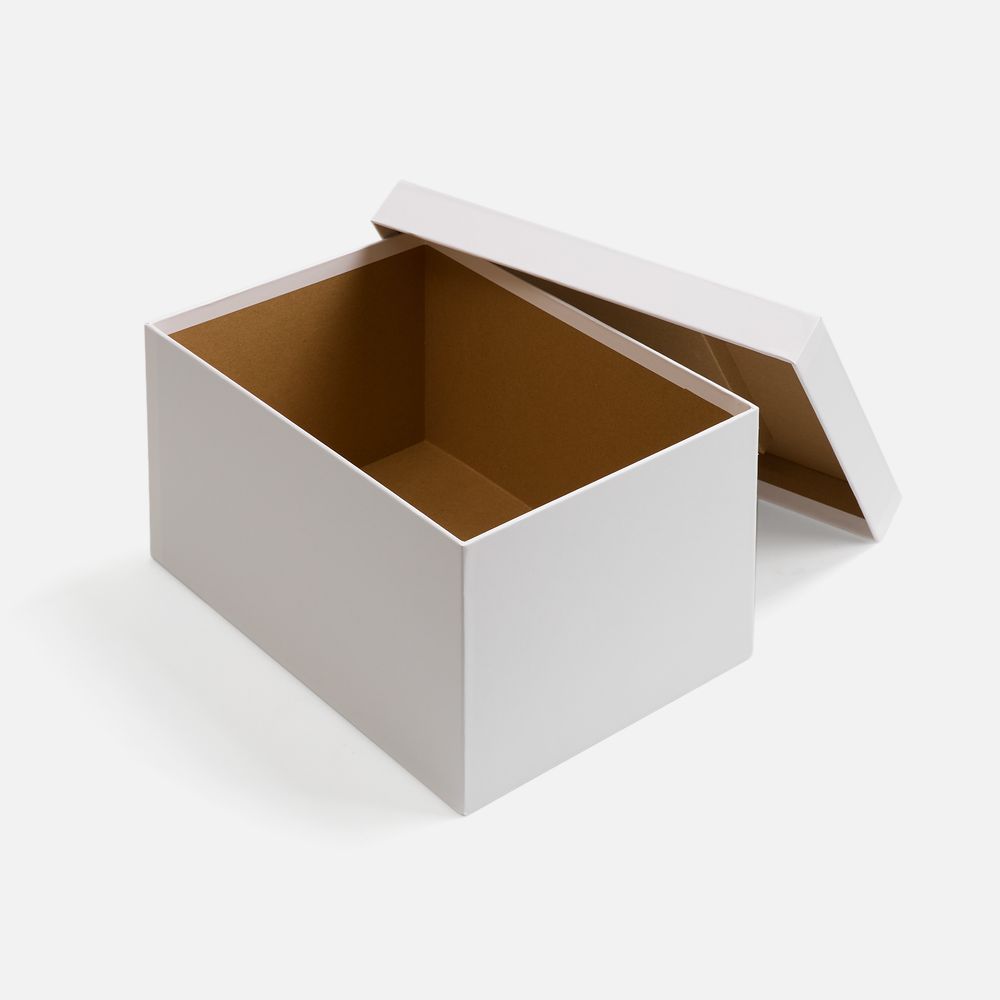 Коробка из переплетного картона, кашированного белой дизайнерской бумагой.