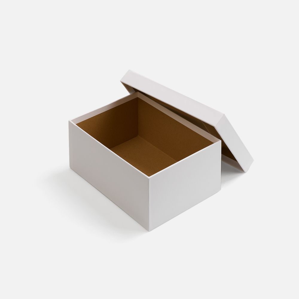 Коробка из переплетного картона, кашированного белой дизайнерской бумагой.
