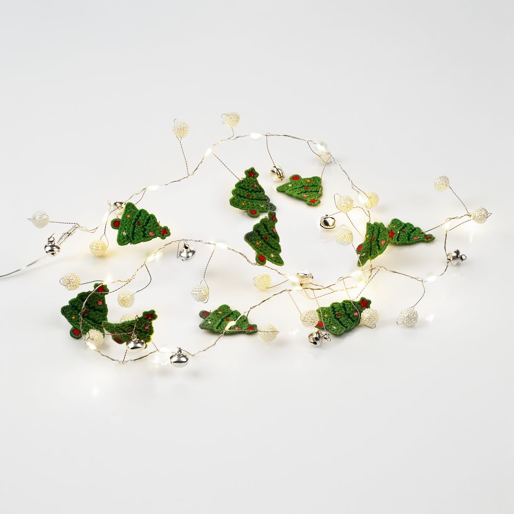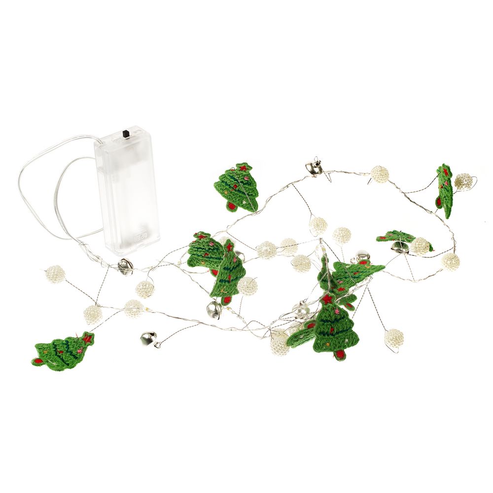10 елочек, бусины и 20 лампочек с теплым светом. Работает от 2 батареек АА (в комплект не входят).