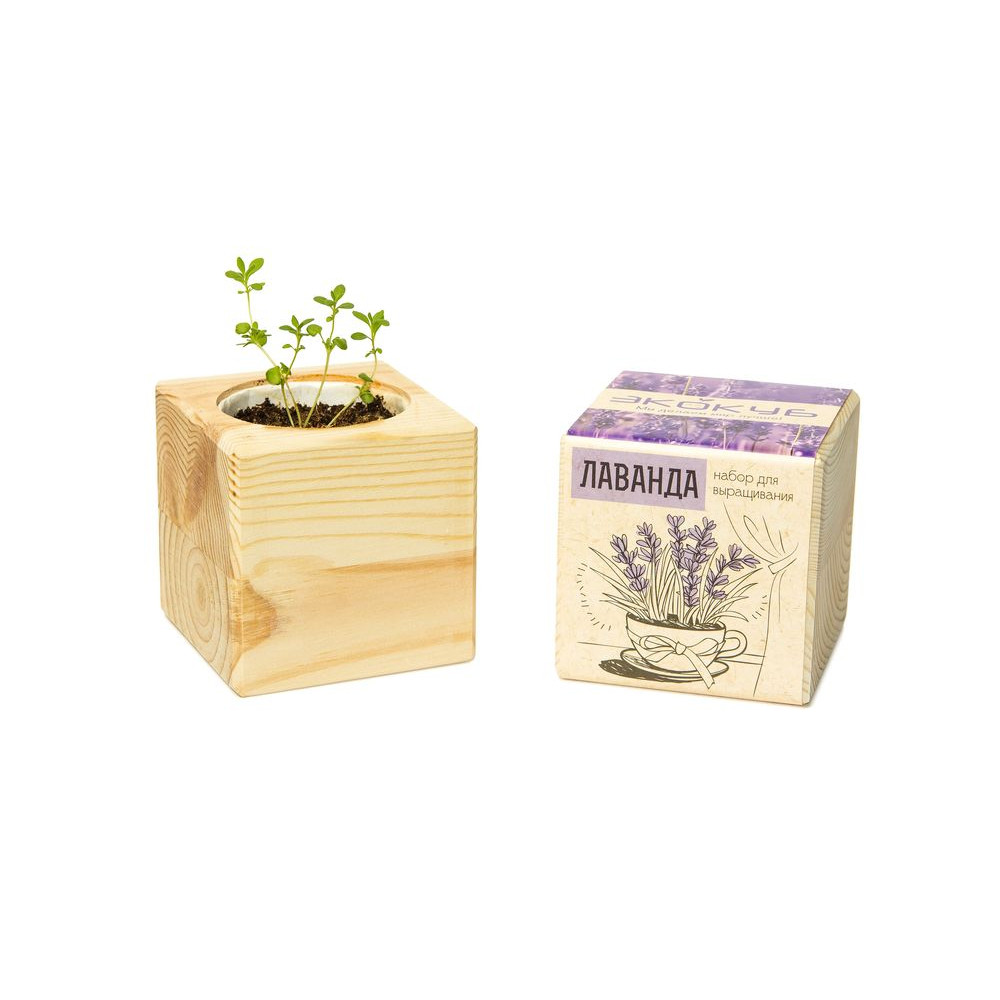 В наборе: деревянный куб, грунт, семена лаванды.