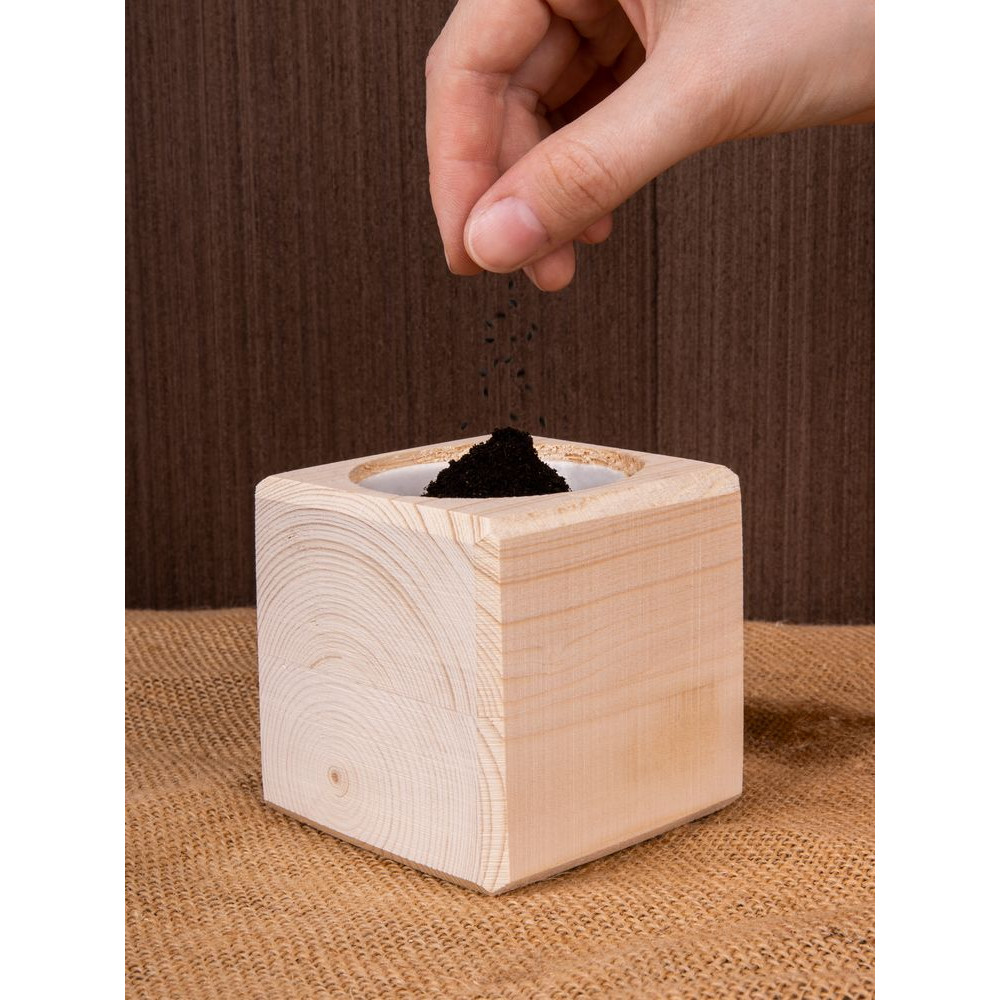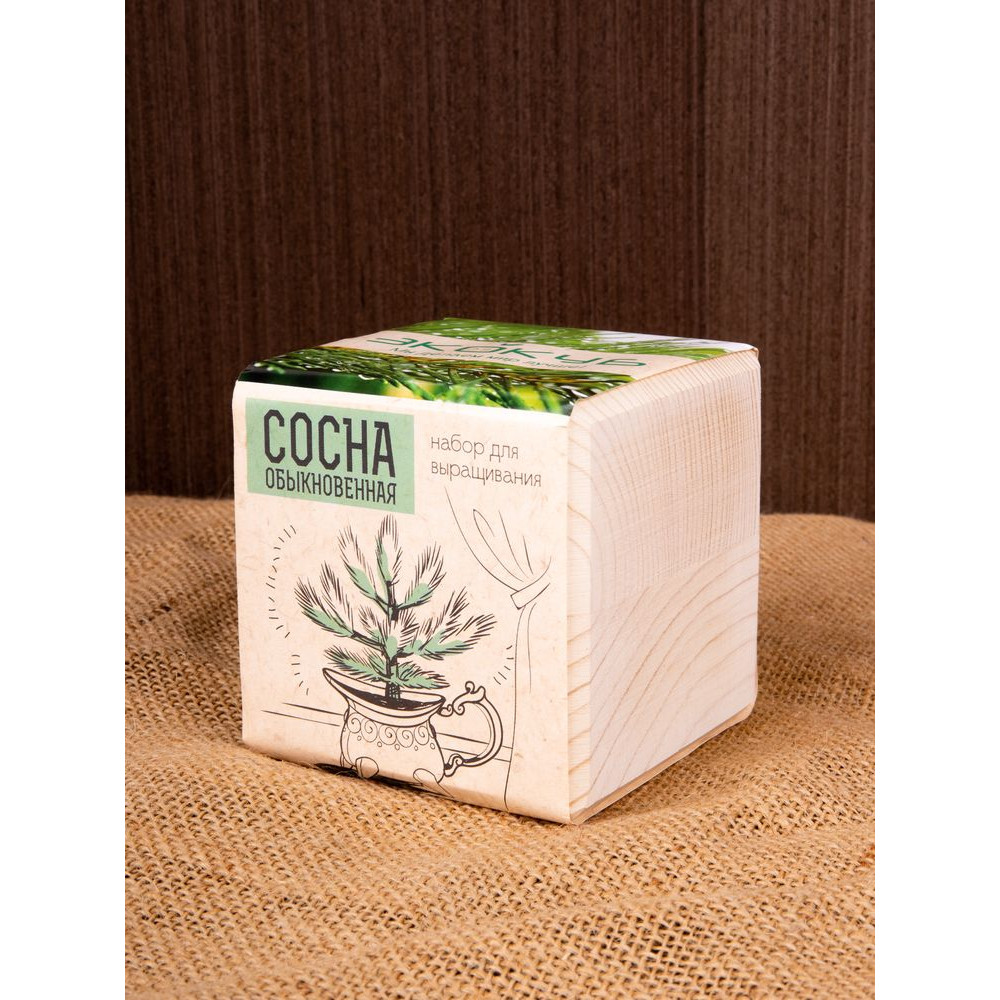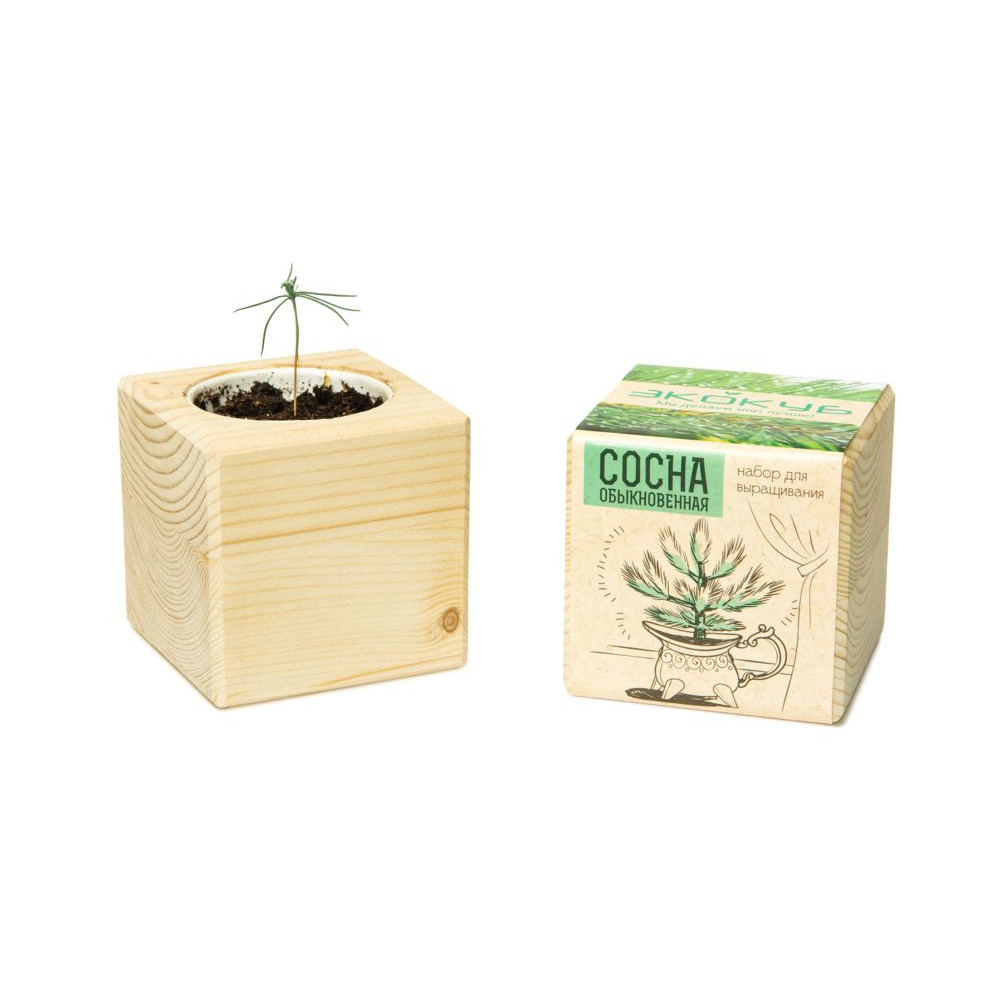 В наборе: деревянный куб, грунт, семена сосны.