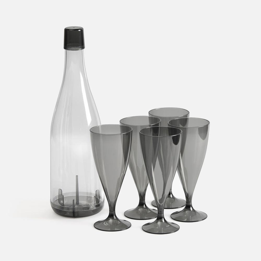 В наборе 5 бокалов. Бутылка может использоваться только как футляр.