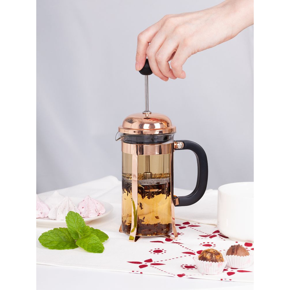 Элегантная оправа цвета розового золота защитит колбу от повреждений, а пластиковая ручка не даст обжечься о горячую поверхность.