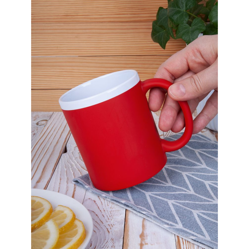 Кружка классической формы StopSpot привлекает внимание своим дизайном и покрытием. Яркая матовая поверхность выигрышно контрастирует с глянцевым белым ободком — так кружка выглядит необычно, а еще меньше пачкается во время эксплуатации.