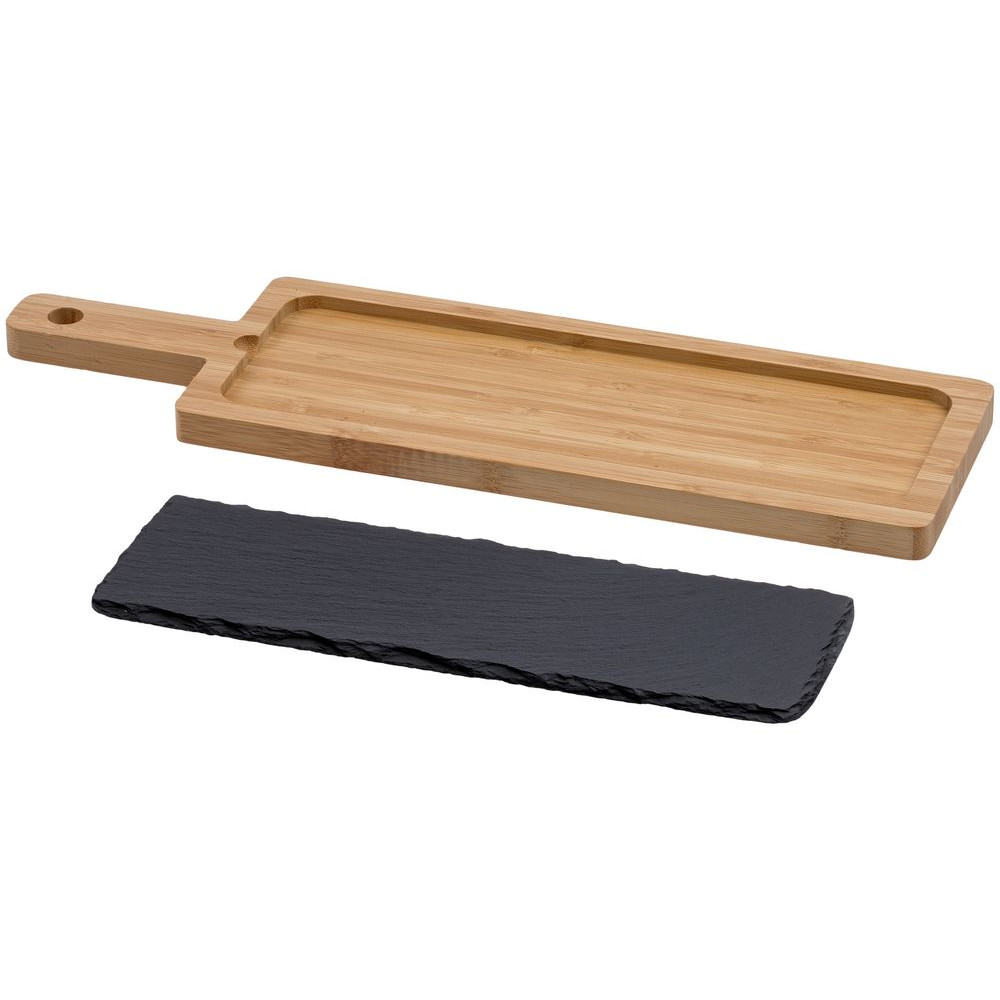 Сервировочная доска из бамбука со сланцевой вставкой может использоваться для оригинальной подачи сыра, хлеба и любых других закусок. За сланцевой посудой легко ухаживать, она не подвержена распространению грибка и бактерий. Перед первым применением доску следует помыть с использованием моющих средств.
