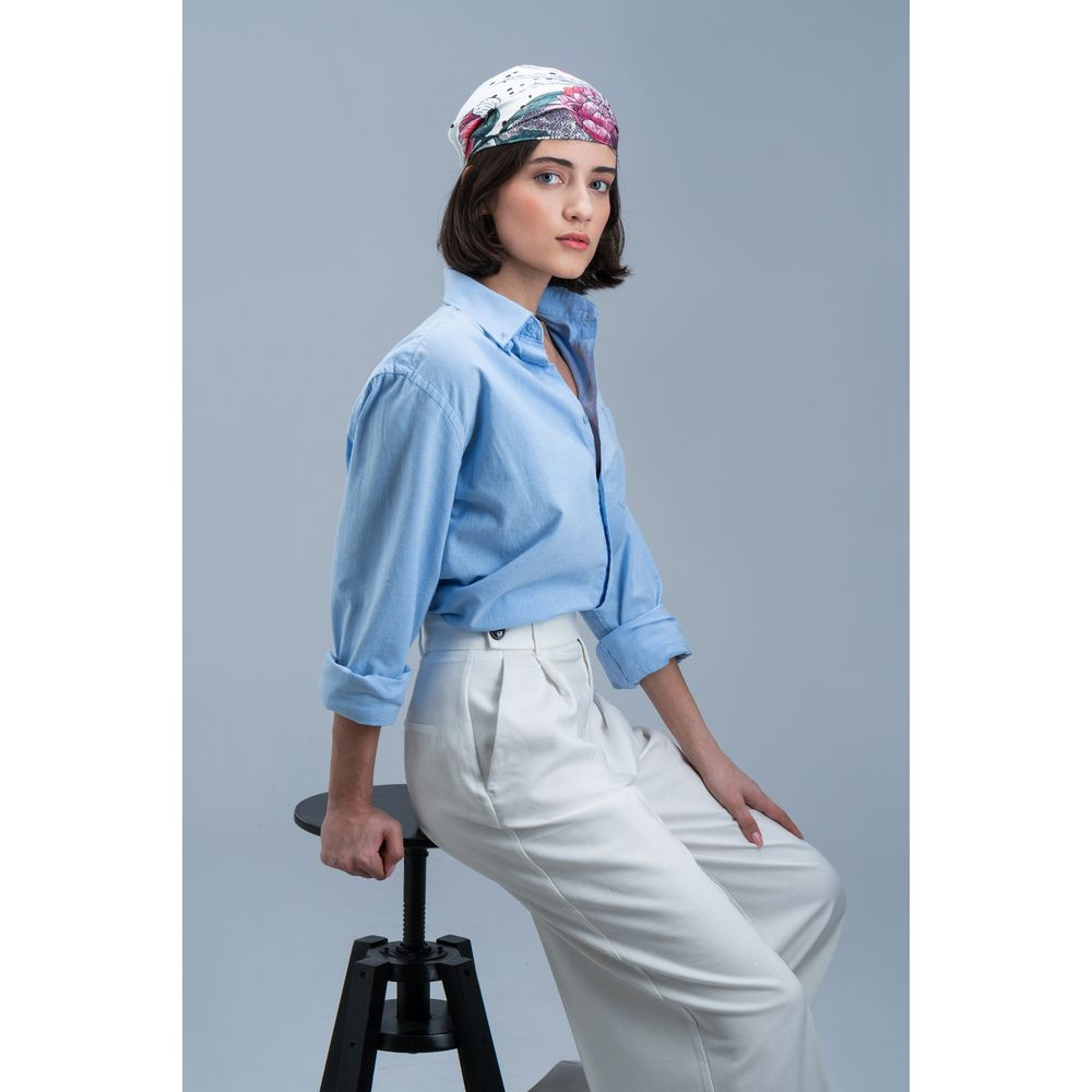 Шелковый платок с цветочным принтом открывает простор фантазии — его можно использовать как шарф, головной убор или декоративный элемент для верхней одежды и аксессуаров.