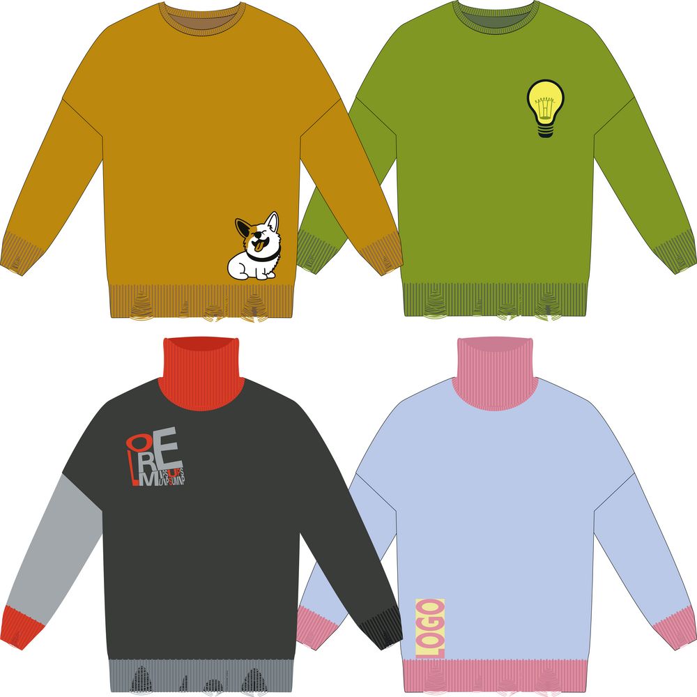 Свитер унисекс с вывязанным логотипом и индивидуальным рисунком в фирменной цветовой гамме.