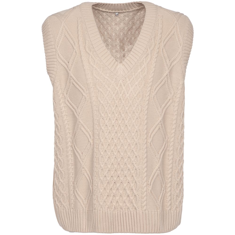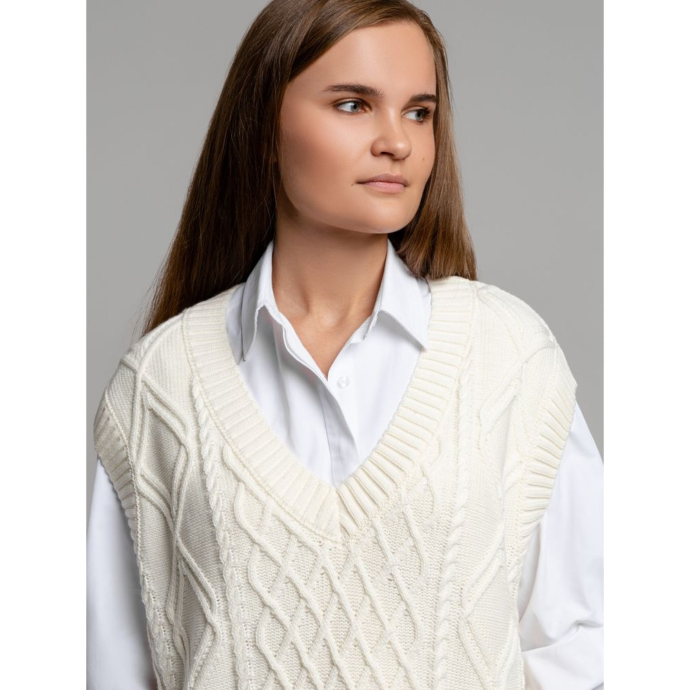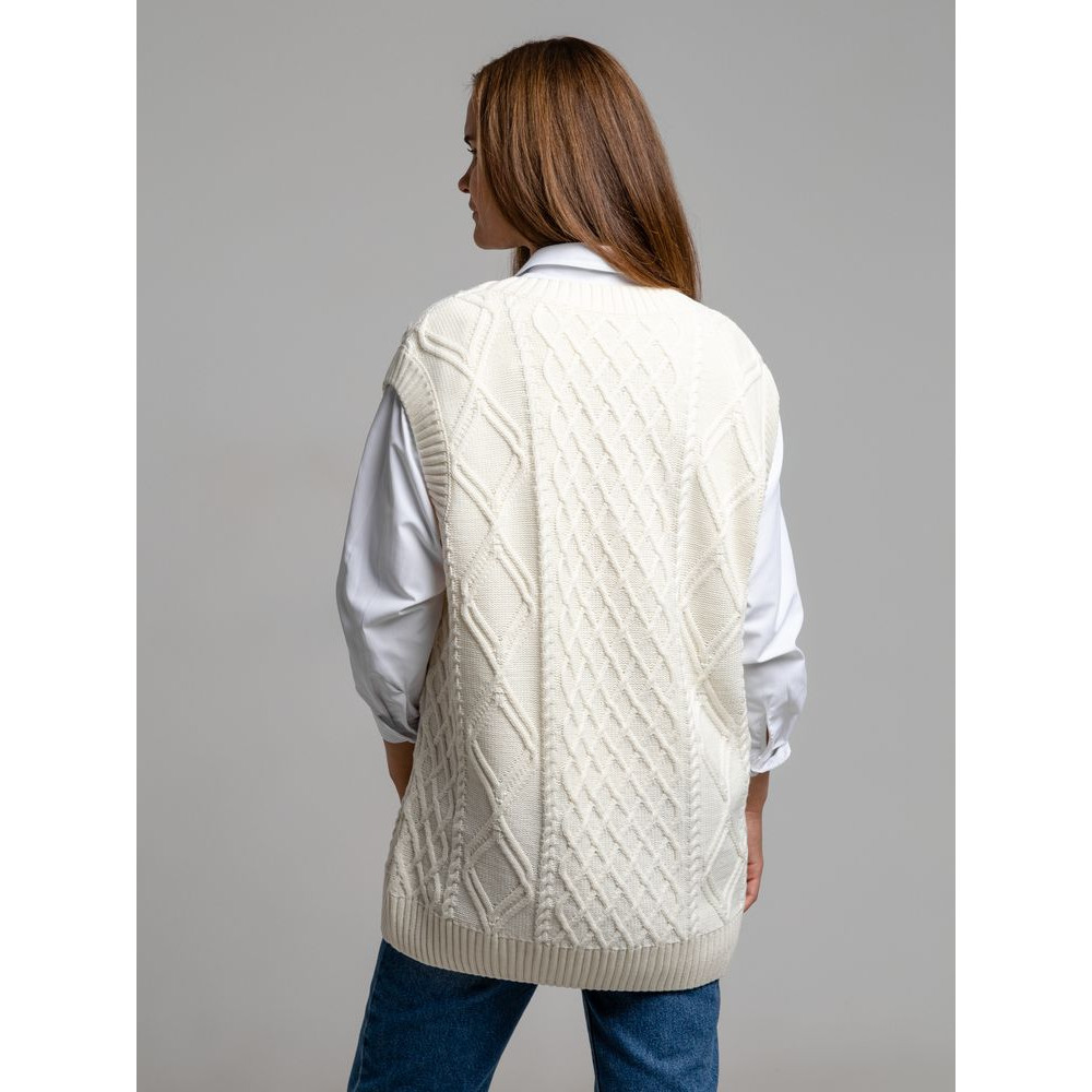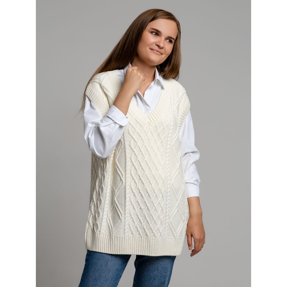 Модель: однотонный жилет крупной вязки с узорами в виде кос. Силуэт оверсайз, спущенное плечо.