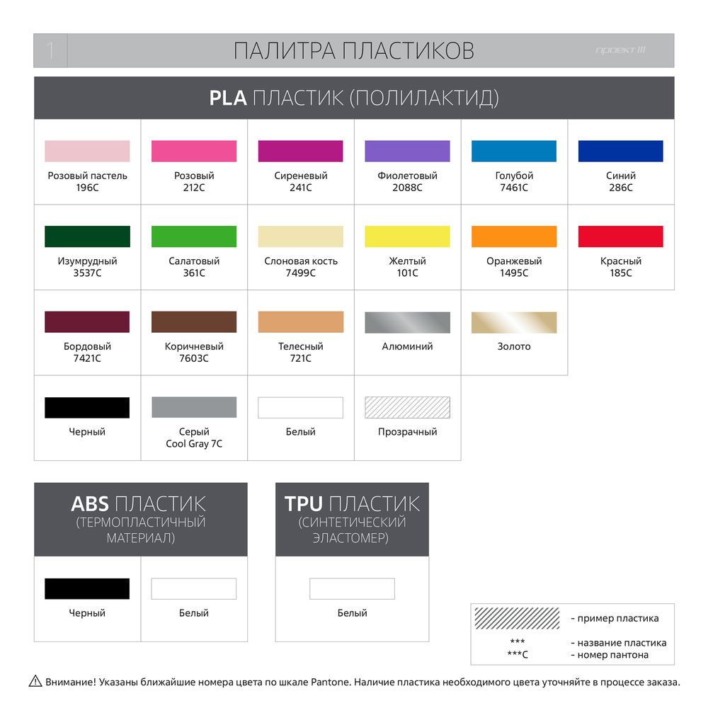 В стоимость входит изготовление фигурки из пластика в 1 цвет с базовой обработкой — удалением технических элементов. Печать фигурки в 2 и более цветов производится по индивидульному расчету.