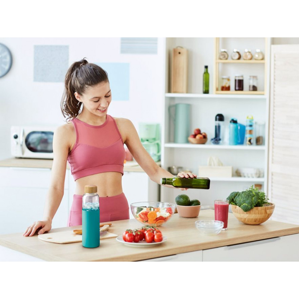 Бутылка со стеклянной колбой и крышкой из бамбука — изящное решение для тех, кто предпочитает природные материалы. Яркий силиконовый чехол защищает колбу от повреждений.
