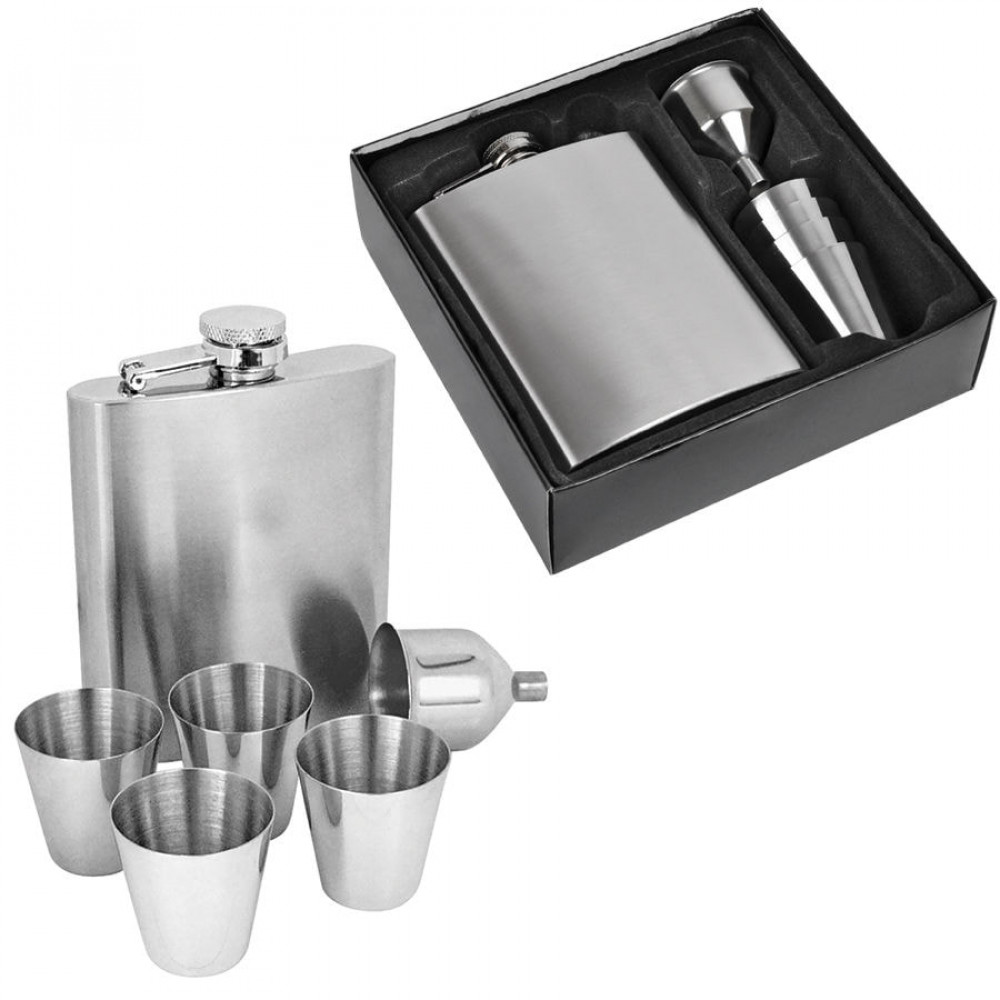 Параметры: Фляжка с 4 стопками и воронкой в упаковке; 17,8х15х4,5 см; 235 мл; металл; лазерная гравировка